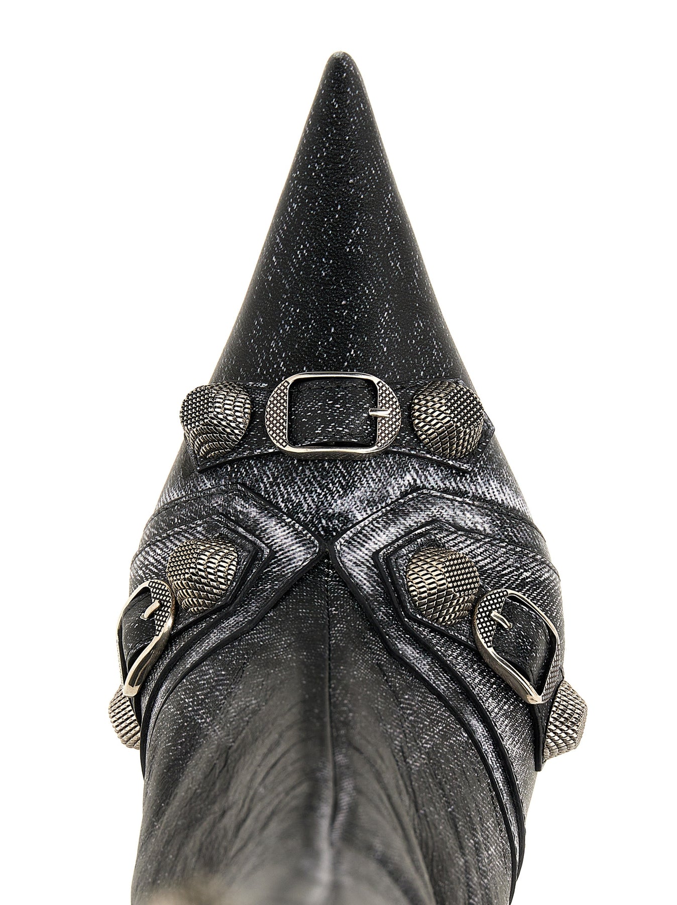 'Cagole' boots in denim print nappa leather, antiqued silver studs and buckle detail, heel, side zip closure.