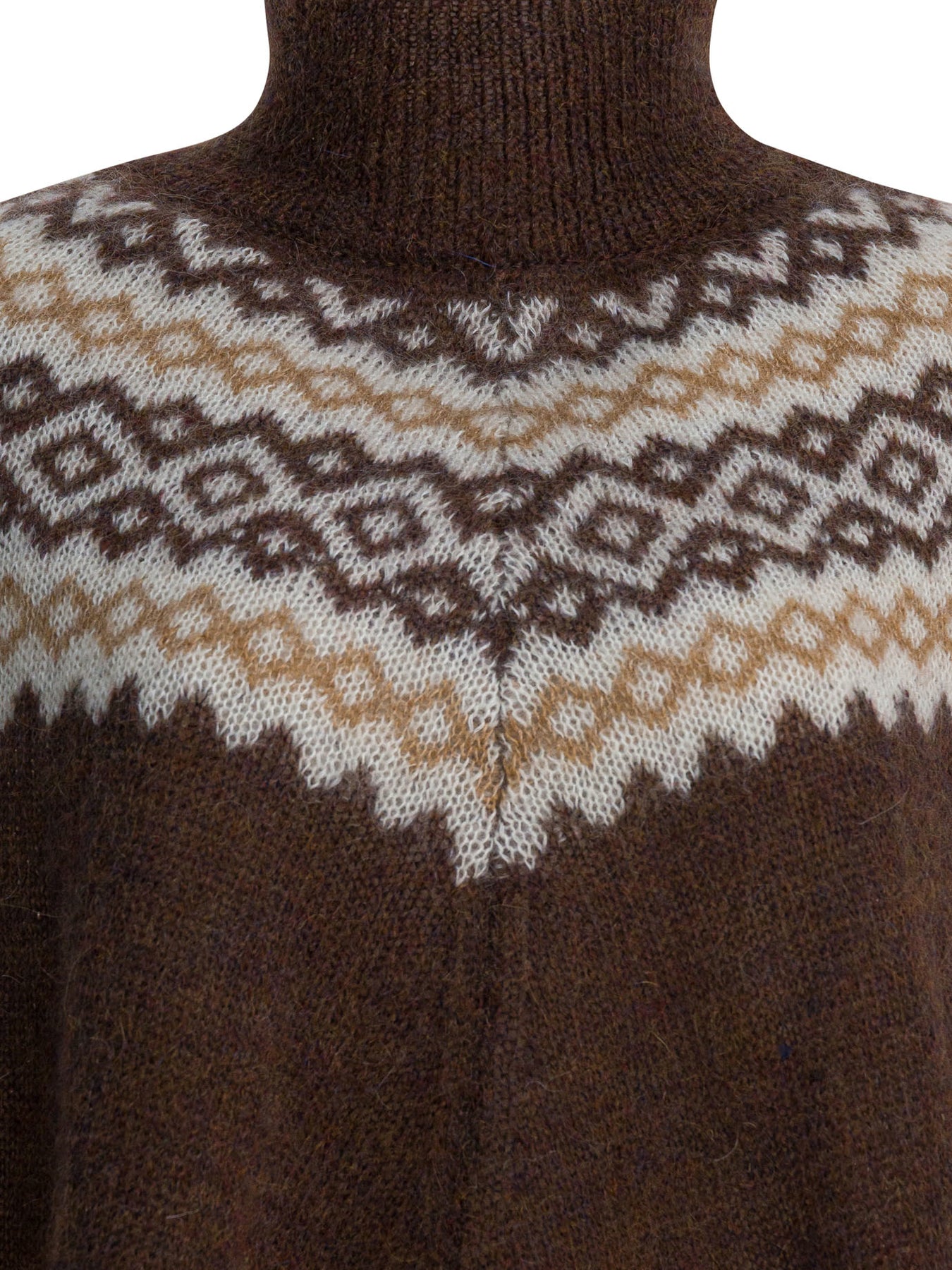 Rakki's "Anna Marie Poncho" cape, with sweeping lines, constructed of Norwegian jacquard knit with three central and lower patterns. The structure features a draped, symmetrical silhouette finished with fringing along the edge. The standing collar is rib-knit and incorporates a jacquard shuttle label sewn into the side. The ensemble highlights a compact fabrication with exposed technical details. || - Knitted jersey - Norwegian jacquard - Standing collar in rib - Jacquard shuttle label - Bangs - Relaxed fit