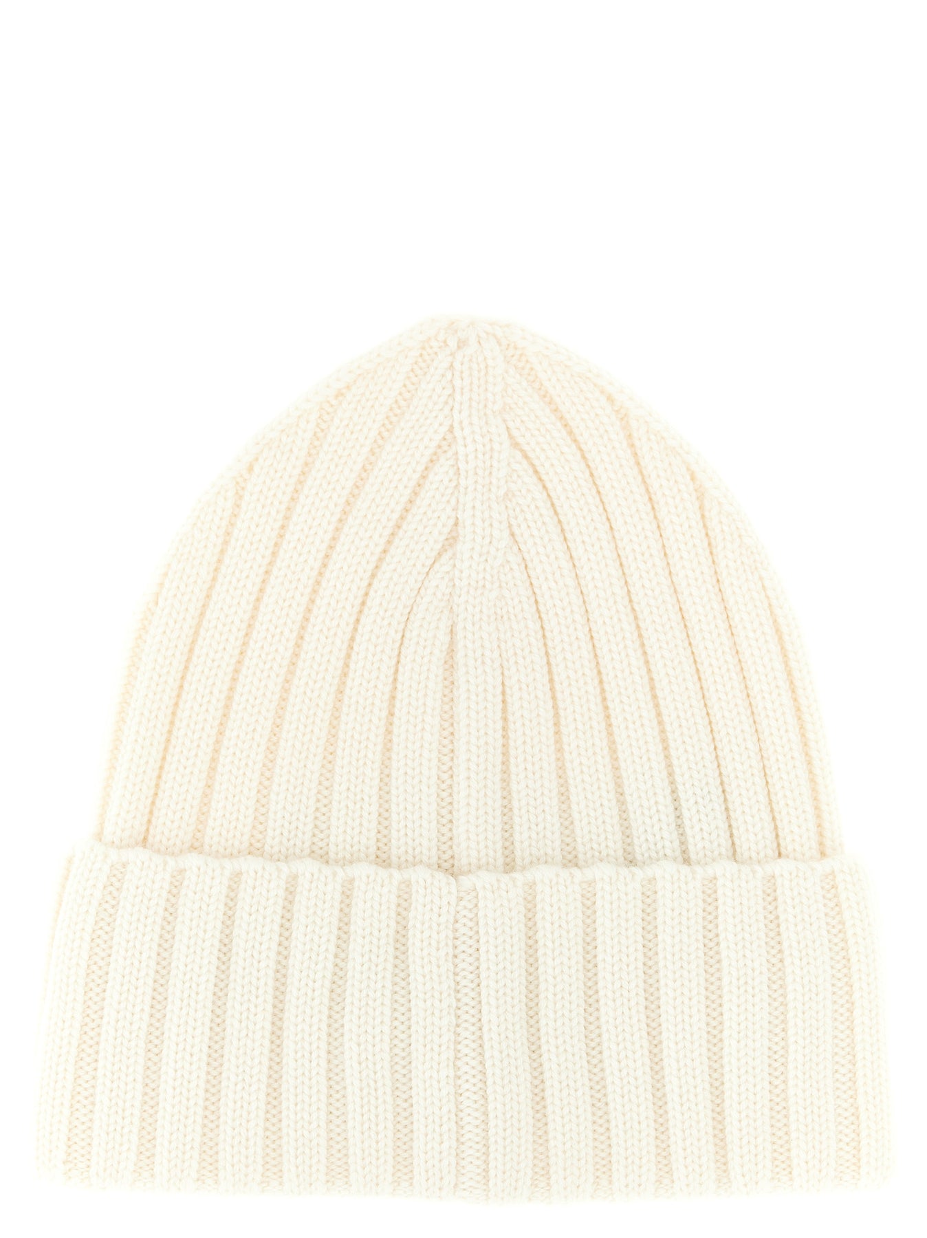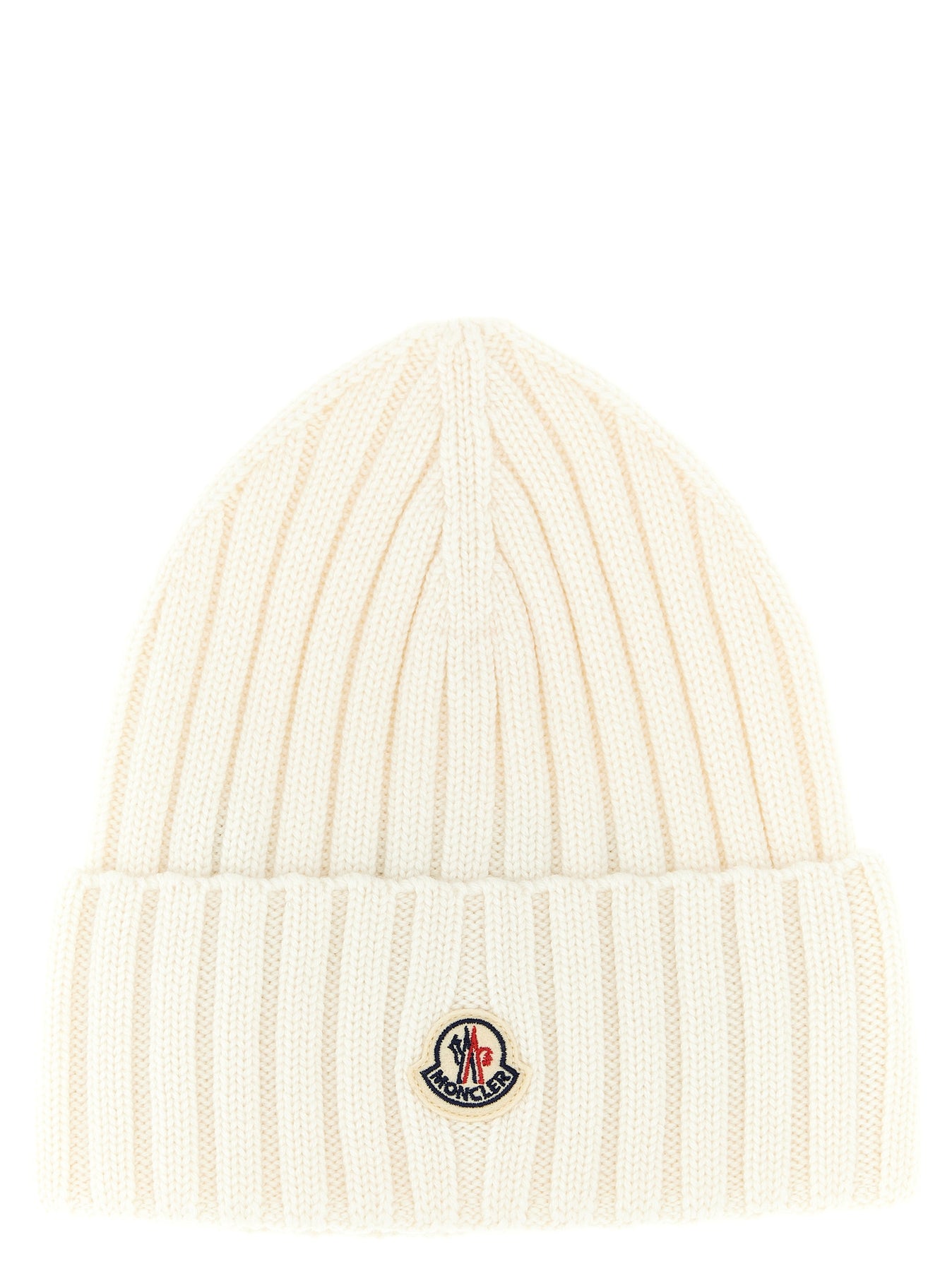 Virgin wool ribbed knit beanie with turn-up with front felt logo patch.