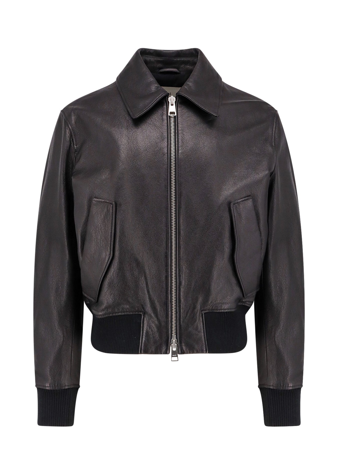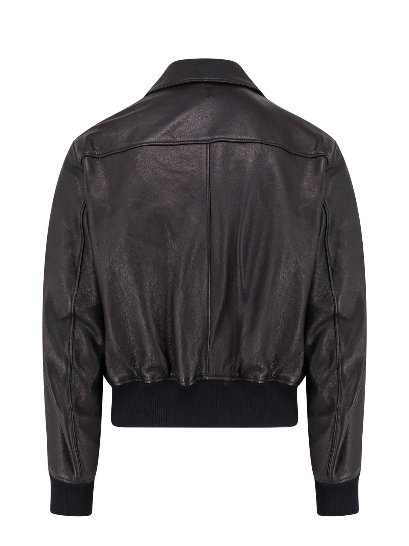SKU: UJK038LH0044_001 - Pointed collar closure with zip and double slider frontal pockets with flap and button ribbed stretch profiles leather