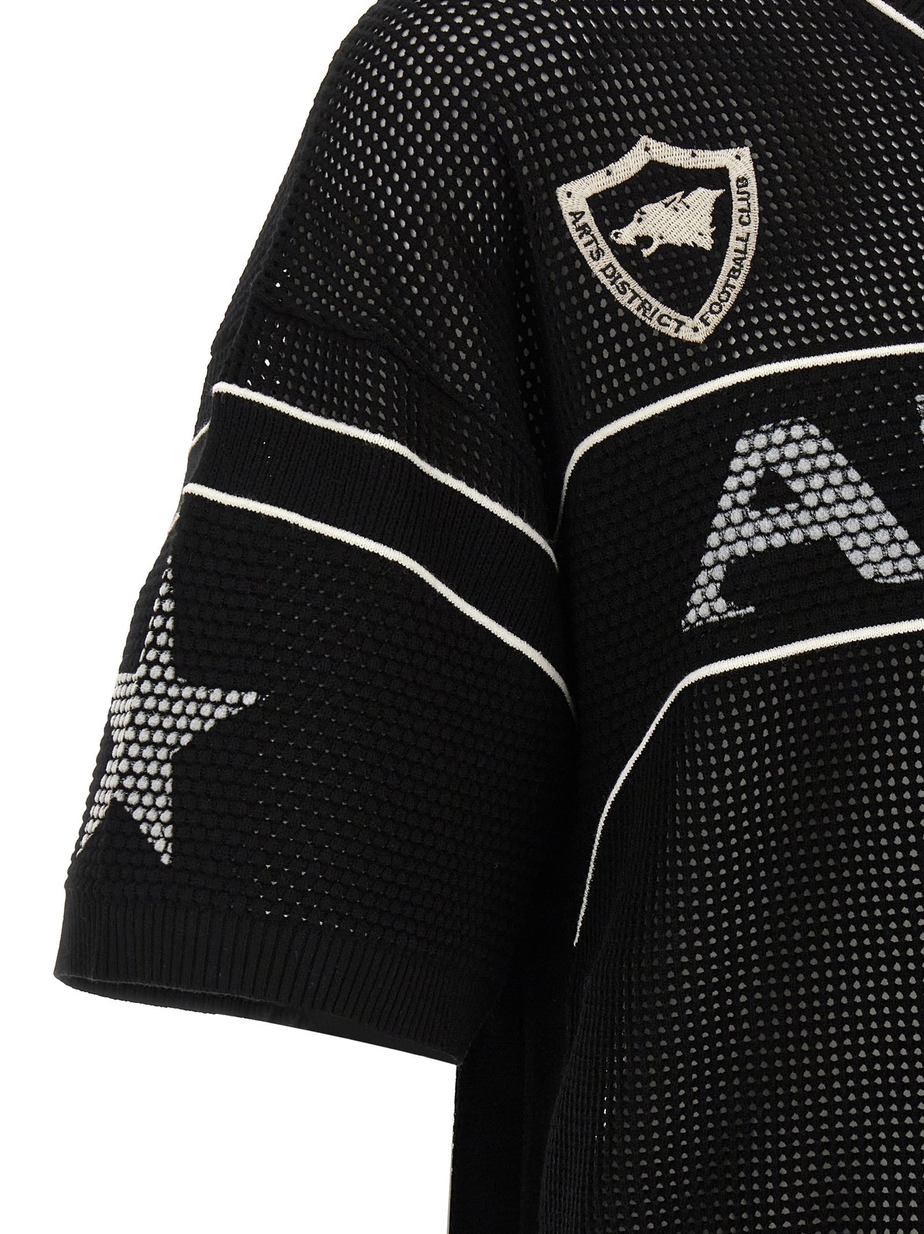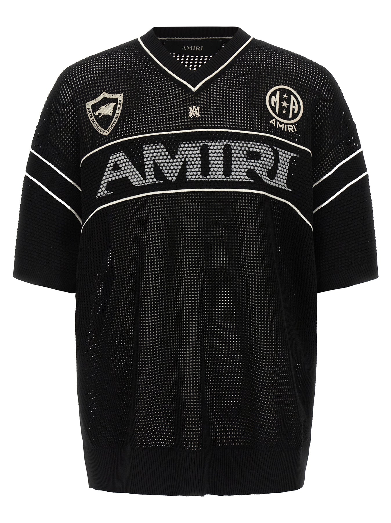 'Amiri Sport' viscose mesh knit T-shirt with contrast embroidery on the front and back, V-neck, short sleeves with dropped shoulders. This garment has undergone a special process that has resulted in intentional variations in shades and colors and adds unique characteristics to the garment.