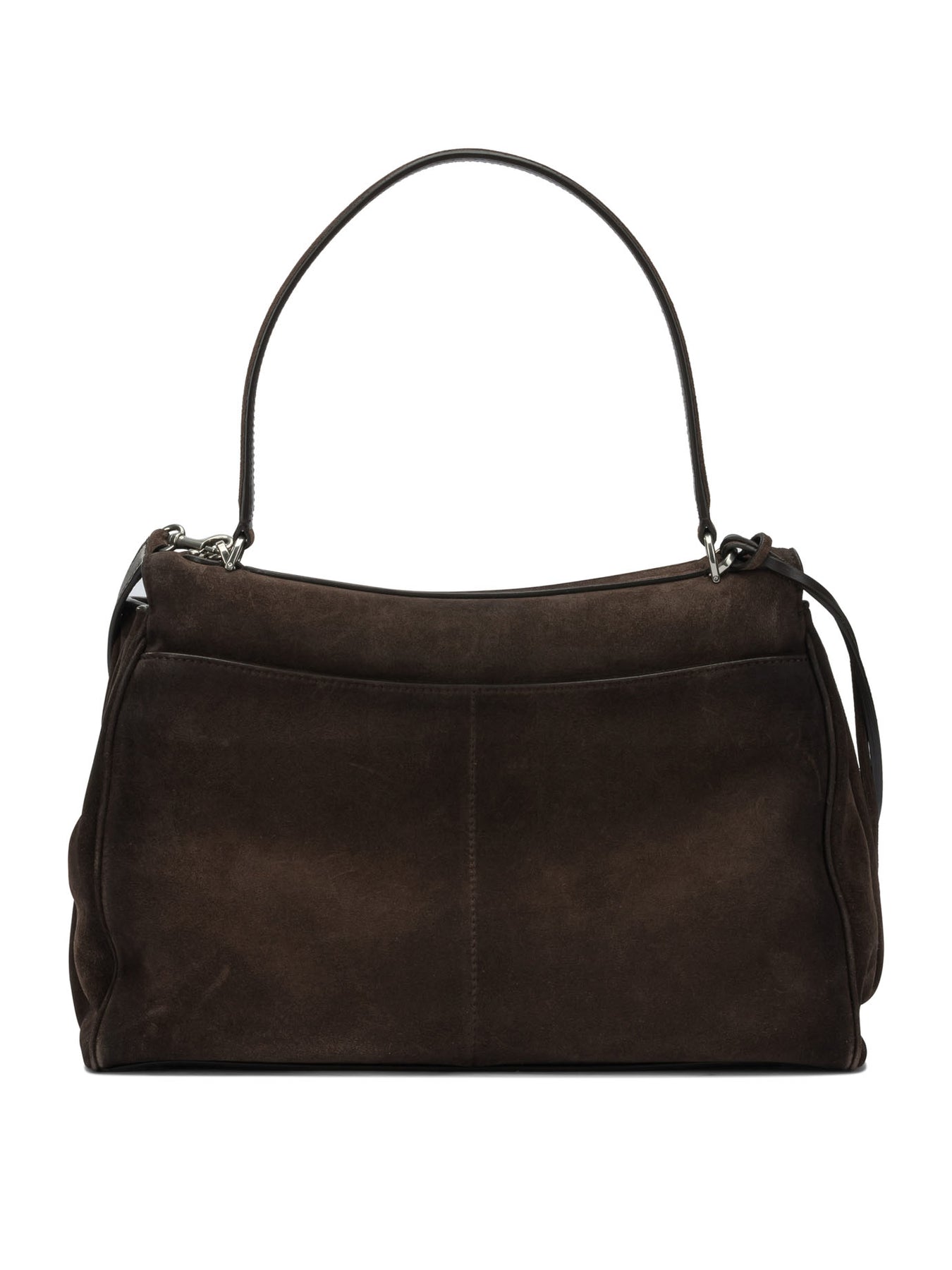Balenciaga "Rodeo" shoulder bag made of waxed suede and smooth calfskin leather. The compact structure features a top handle and a removable shoulder strap. The silhouette highlights soft lines and rounded profile. The metal swivel closure with an antiqued silver finish combines with a large front pocket and side snap buttons that modulate volume. The interior includes a main compartment complete with zippered pocket, back with two flat pockets and lamb nappa leather lining. || - Waxed suede and smooth calfskin leather - Removable top handle and shoulder strap - Removable key holder with double spiral loop - Metal swivel closure - Large pocket on front - Inside zipper pocket - Two flat pockets on the back - Side snap buttons - Four brass feet - Lambskin nappa leather lining