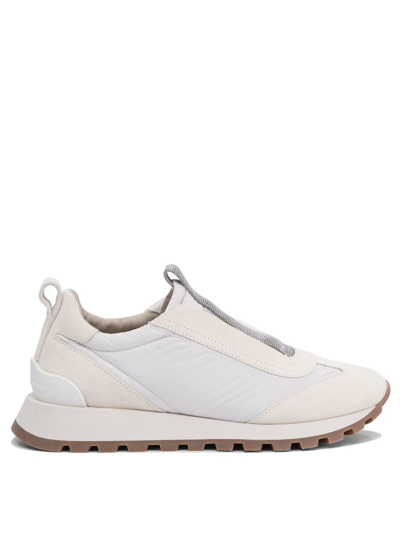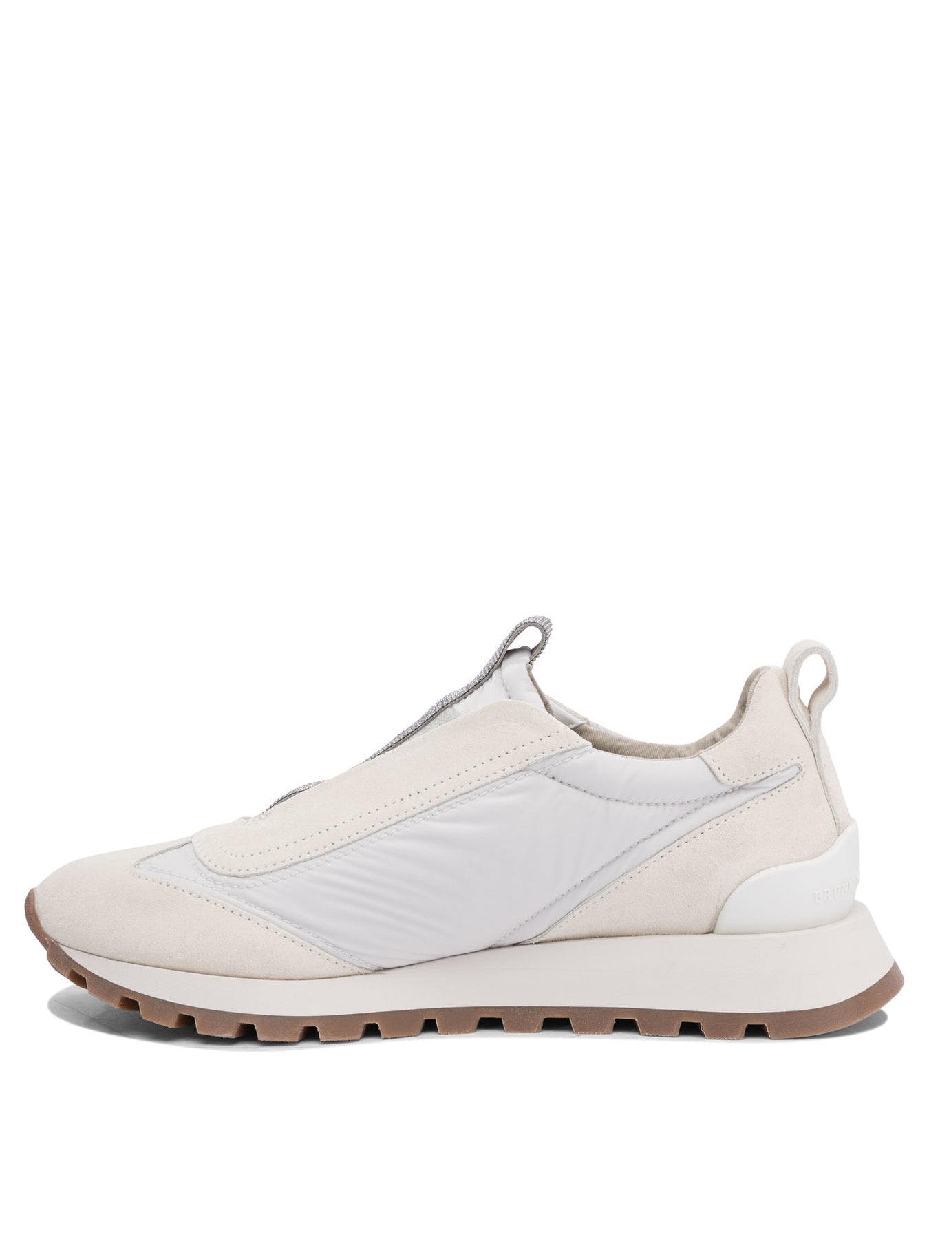 Brunello Cucinelli suede and fabric "Runners" sneaker with Precious Detail featuring a matte techno fabric upper and velvety textured suede inserts. The structure features a sporty silhouette with a tongue embroidered with thin rows of monile. At the heel, a TPU insert with Brunello Cucinelli logo completes the design. Water-repellent cotton-blend lining and lightweight micro sole contribute to comfort and flexibility. || - Techno fabric upper combined with suede - Nickel-free monil embroidered tongue - Water-repellent cotton-blend fabric lining - TPU insert with Brunello Cucinelli logo on the heel - Lightweight micro sole - TPU rubber tread - Eco-friendly product - Brand: Brunello Cucinelli