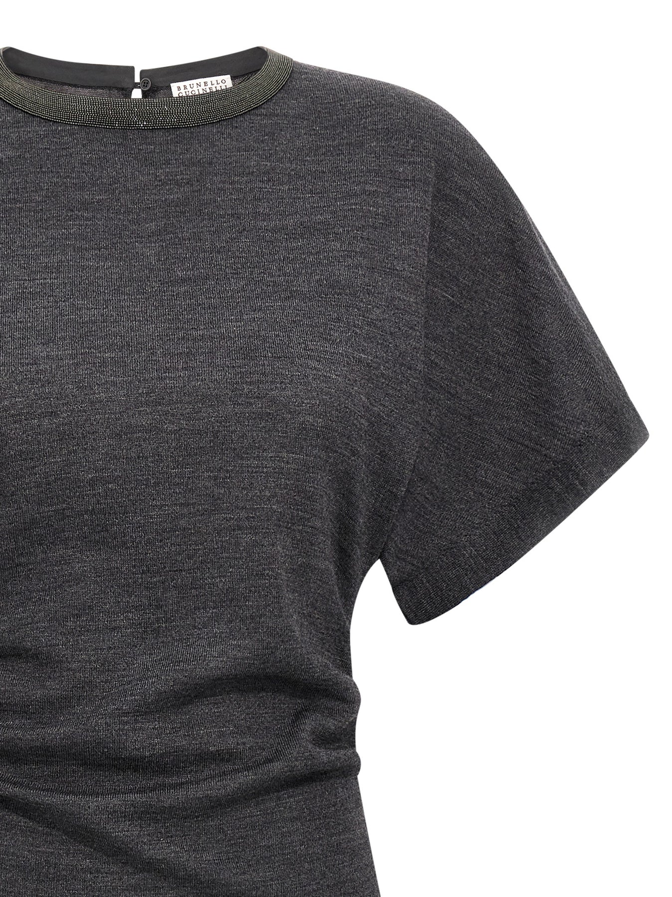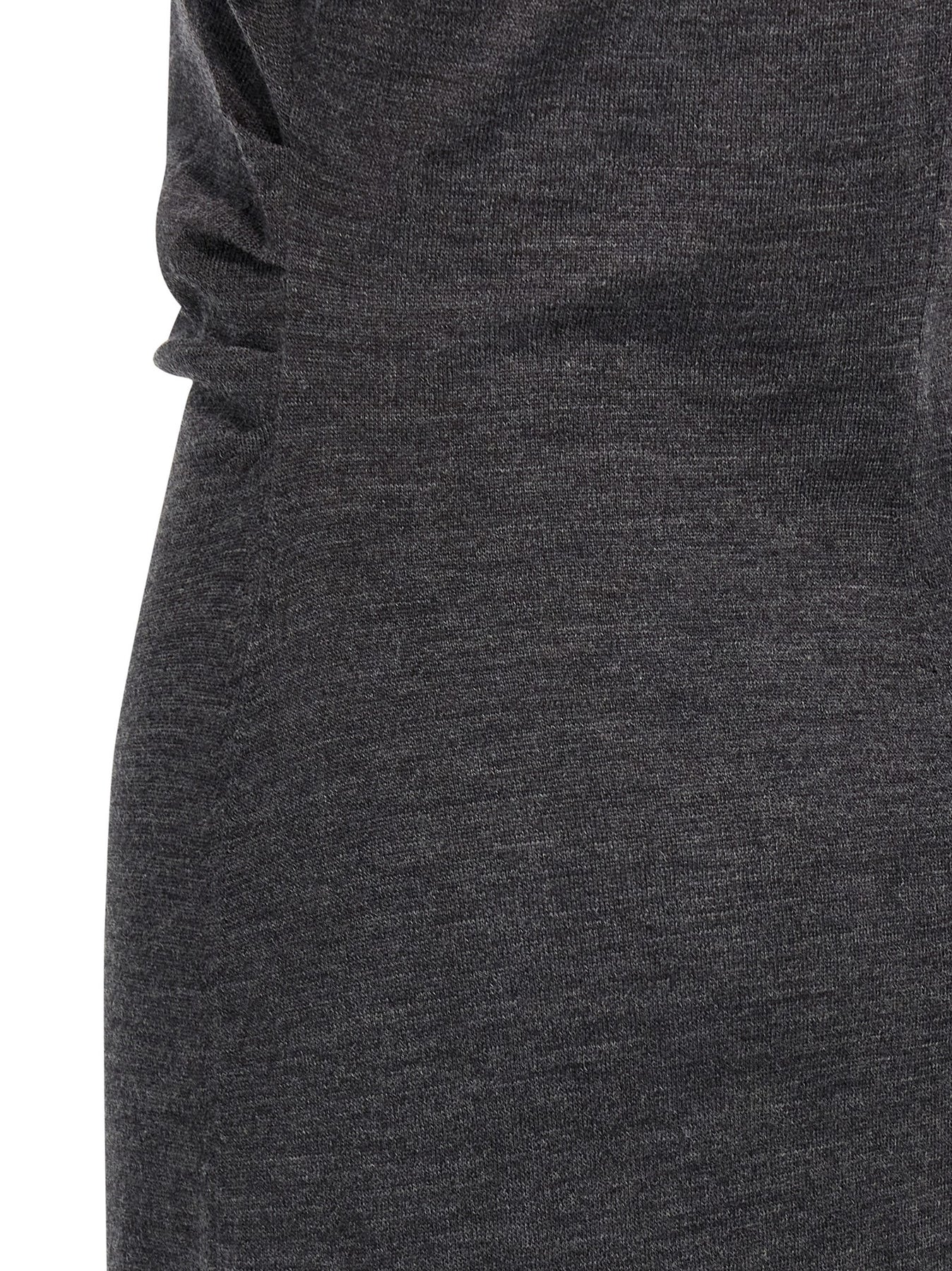 Wool knit midi dress with crew neck with 'Monile' detail, back button closure, curled on the side, short and wide sleeves.