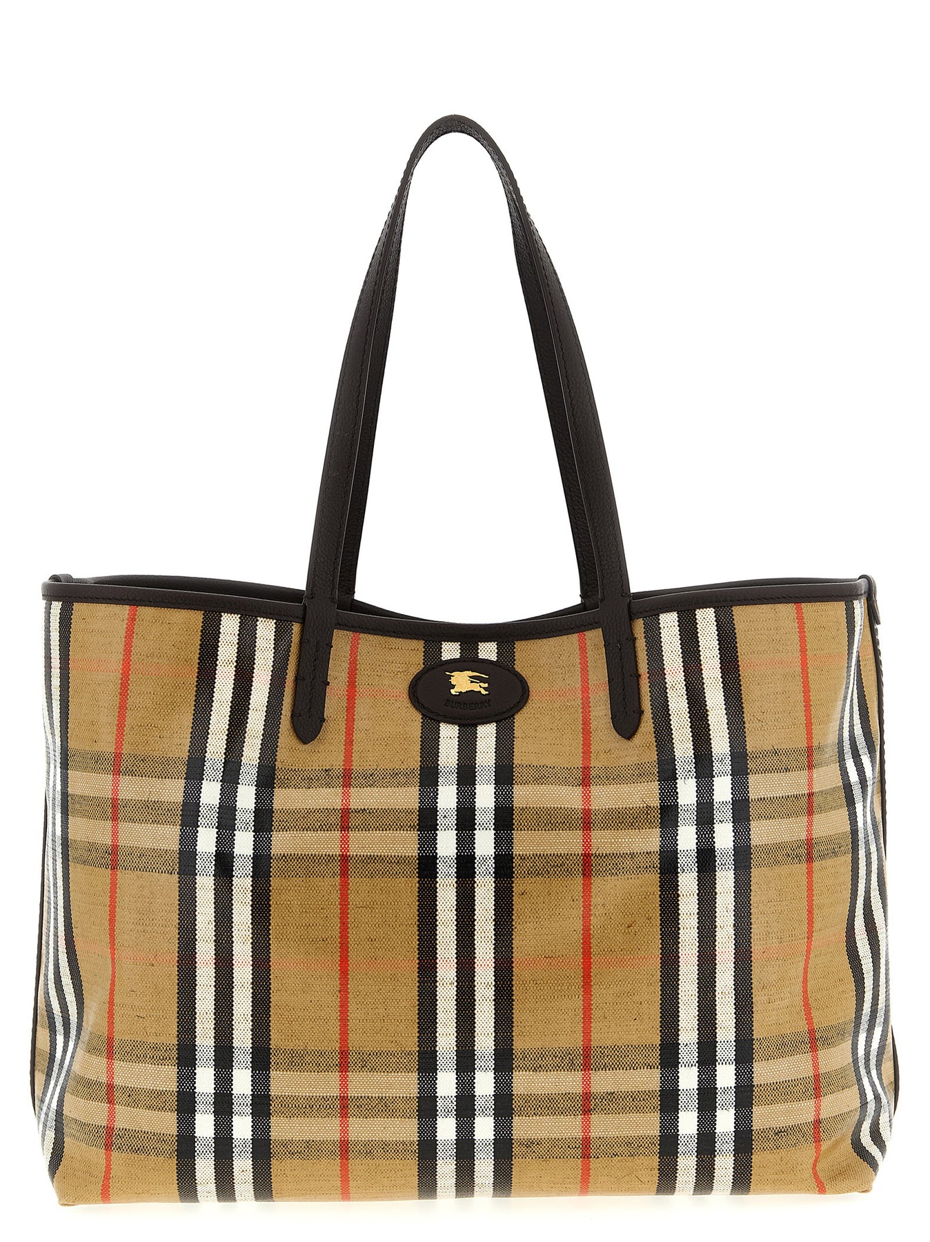 Burberry Check jacquard 'Highlands' cotton and linen blend midi shopping bag with coated finish and smooth calf leather details, double fixed handle, inner snap button closure, unlined leather and metal 'Knight Stamp' patch, removable matching clutch.