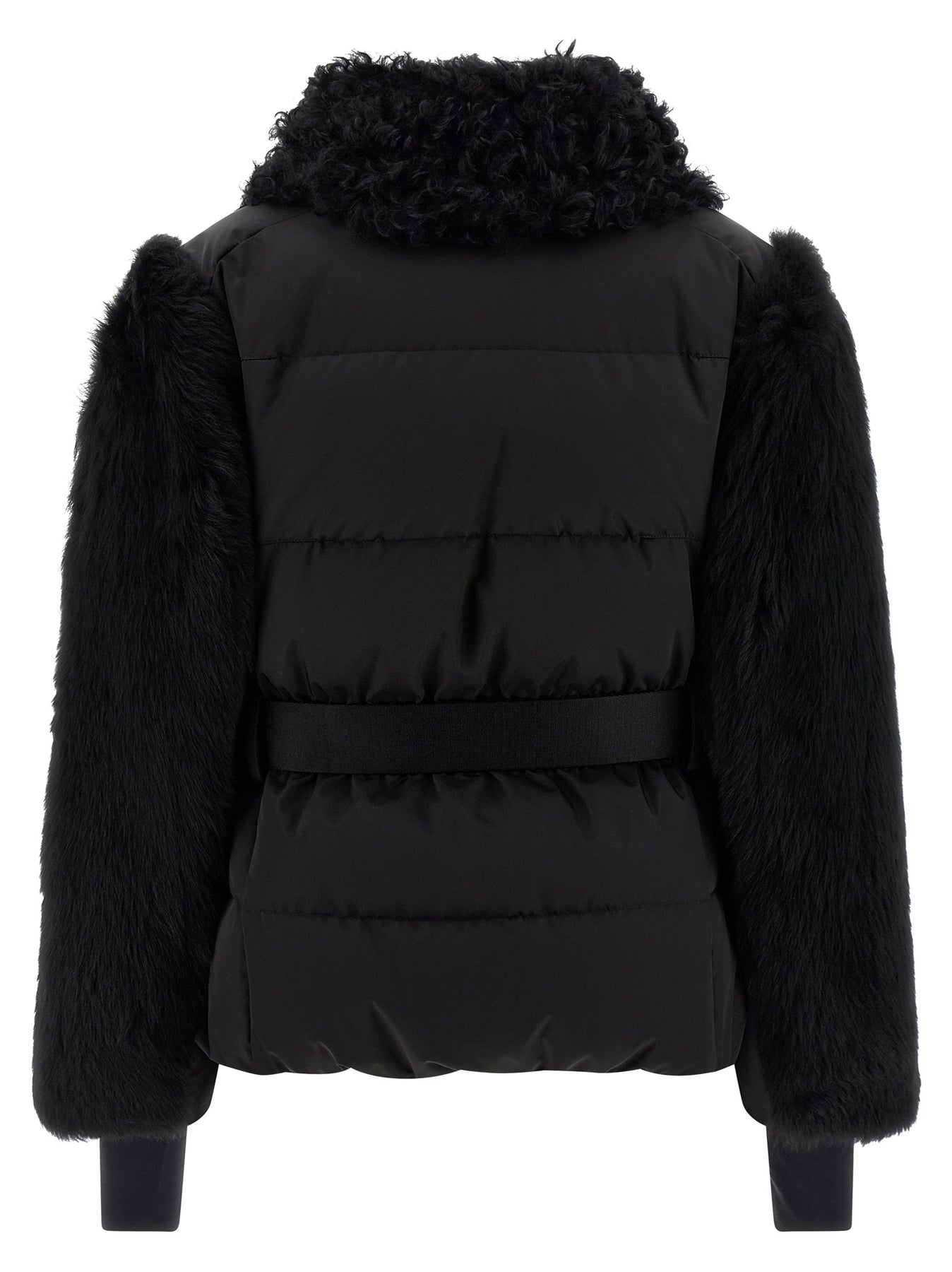'Valdivian' short down jacket in long-haired sheepskin and polyester with micro gabardine details, goose down padded rainwear lining, shearling shearling collar, YKK® AquaGuard® zip closure and snap buttons, pockets, long sleeves with windproof gaiter and logo patch appliqué, inner gaiter on the hem, removable tape belt with leather glove hook detail.