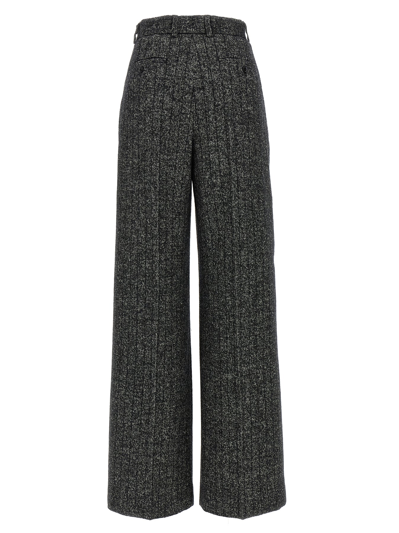 Striped wool trousers, animal print fabric lining, 'Dolce' waist, wide leg with front pins and bellows, zip and button closure, pockets.