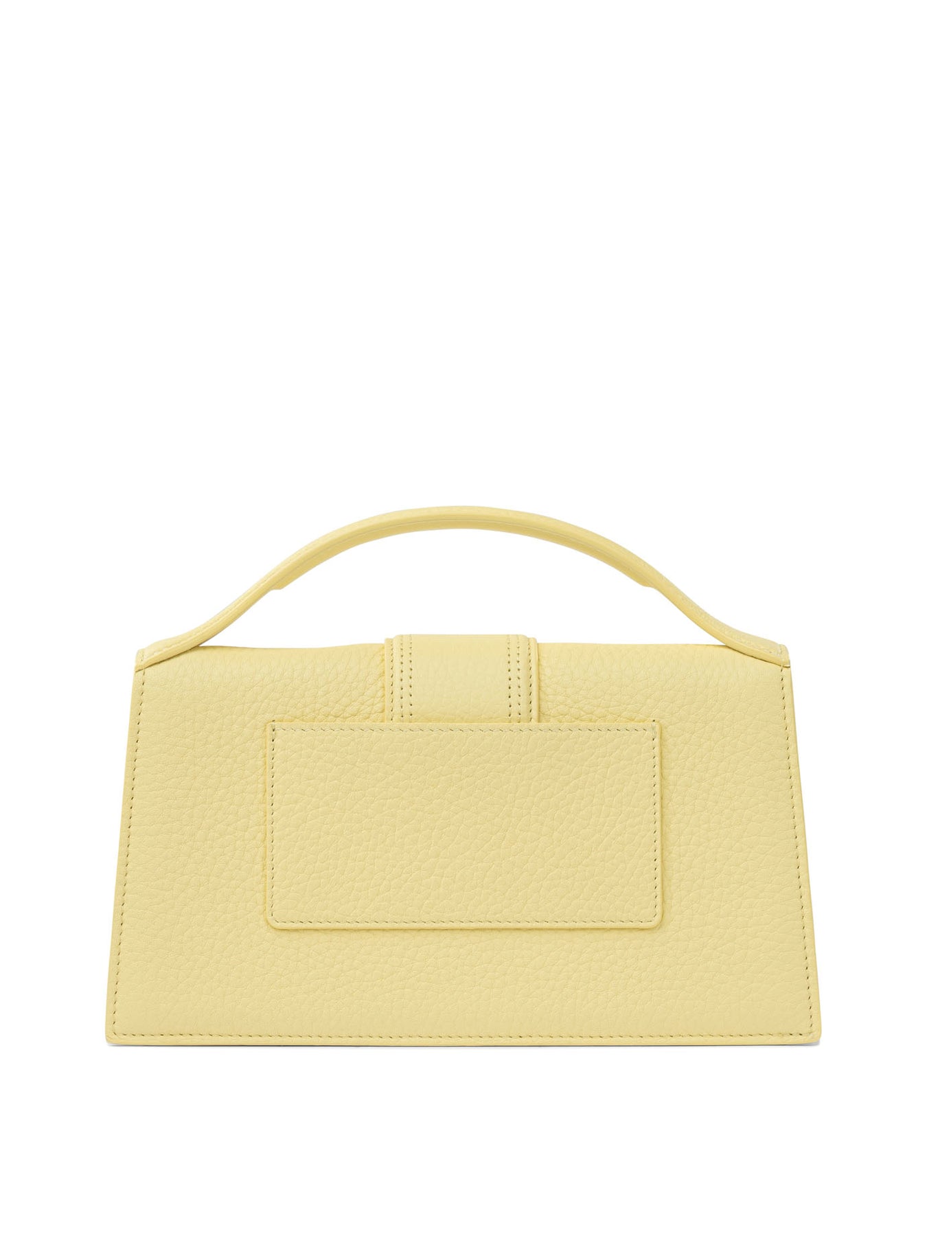 Jacquemus "Le grand Bambino" handbag made of grained leather, featuring a solid structure and a defined rectangular silhouette. The top handle features uniform padding. The front flap closes with an integrated magnetic mechanism. The design includes a removable long shoulder strap and contrast-dyed trimmed edges. Fully lined in cotton, it displays silver metallic elements. || - Textured grained leather - Padded top handle - Magnetic flap closure - Long adjustable and removable shoulder strap - Carabiner closure with engraved logo - Patch pocket on the back - Exposed topstitching - Silver metal trim and logo - Fully cotton-lined pattern - Dyed edges