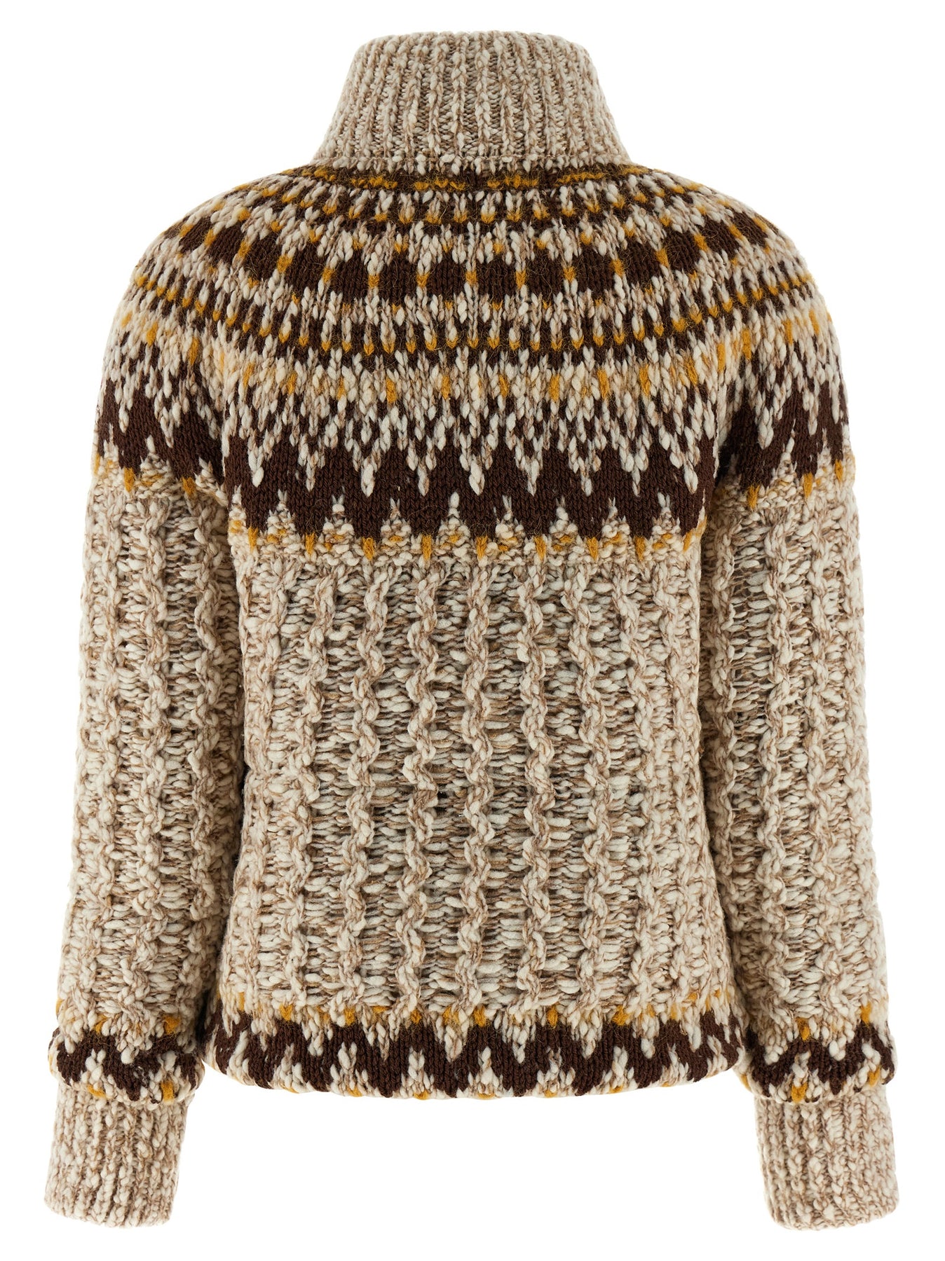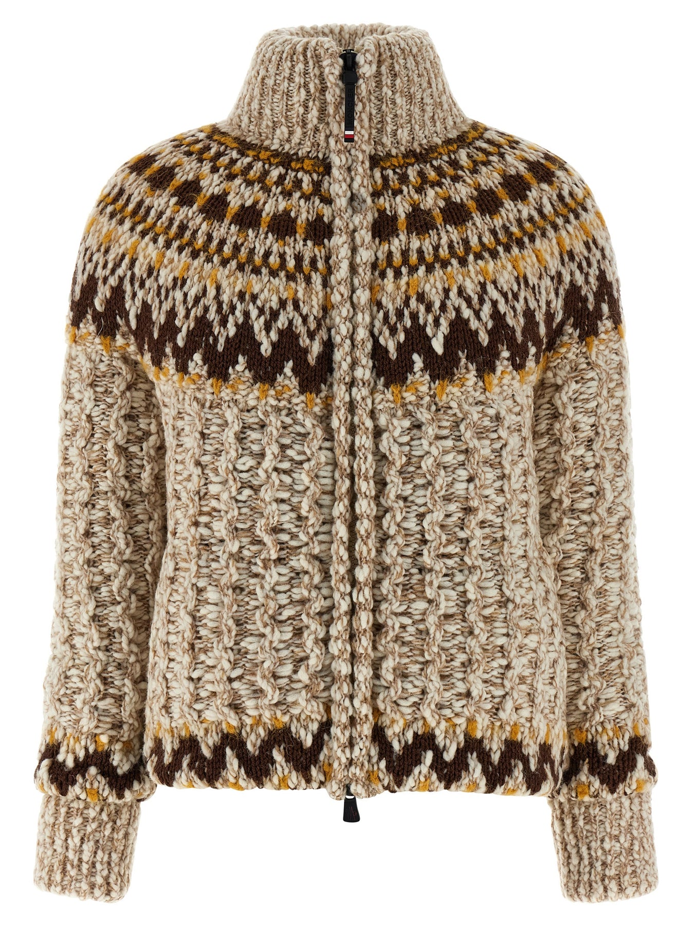 'Girose' wool and nylon blend cardigan 1.5 fineness jacquard geometric pattern, nylon laqué lining with goose down padding, standing collar, front zip closure, pockets, long cuffed sleeves and logo patch appliqué.