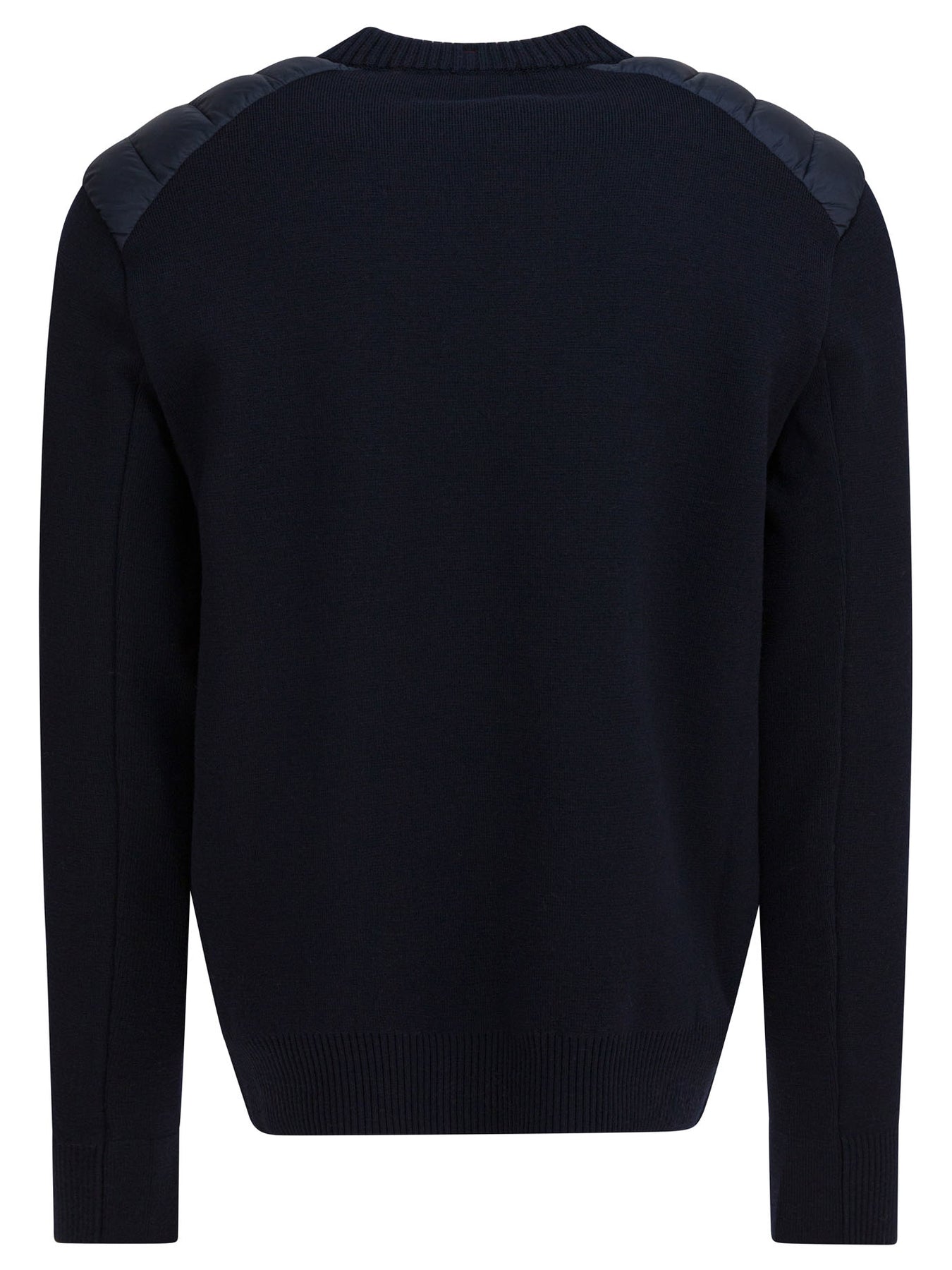 Moncler Grenoble wool crewneck sweater, made of a 14-fine wool blend, with padded construction for thermal insulation. The silhouette features a compact construction, long sleeves and reinforced rainwear epaulettes in technical nylon, positioned to increase protection against external agents. The knit fabrication results in lightweight, while cuffs fitted with stretch gaiters provide grip and functionality at the extremes. || - Applied logo - Long sleeves - Technical nylon details on shoulders - Crew neck - Wrists with elasticized gaiters - Padded construction - Regular fit