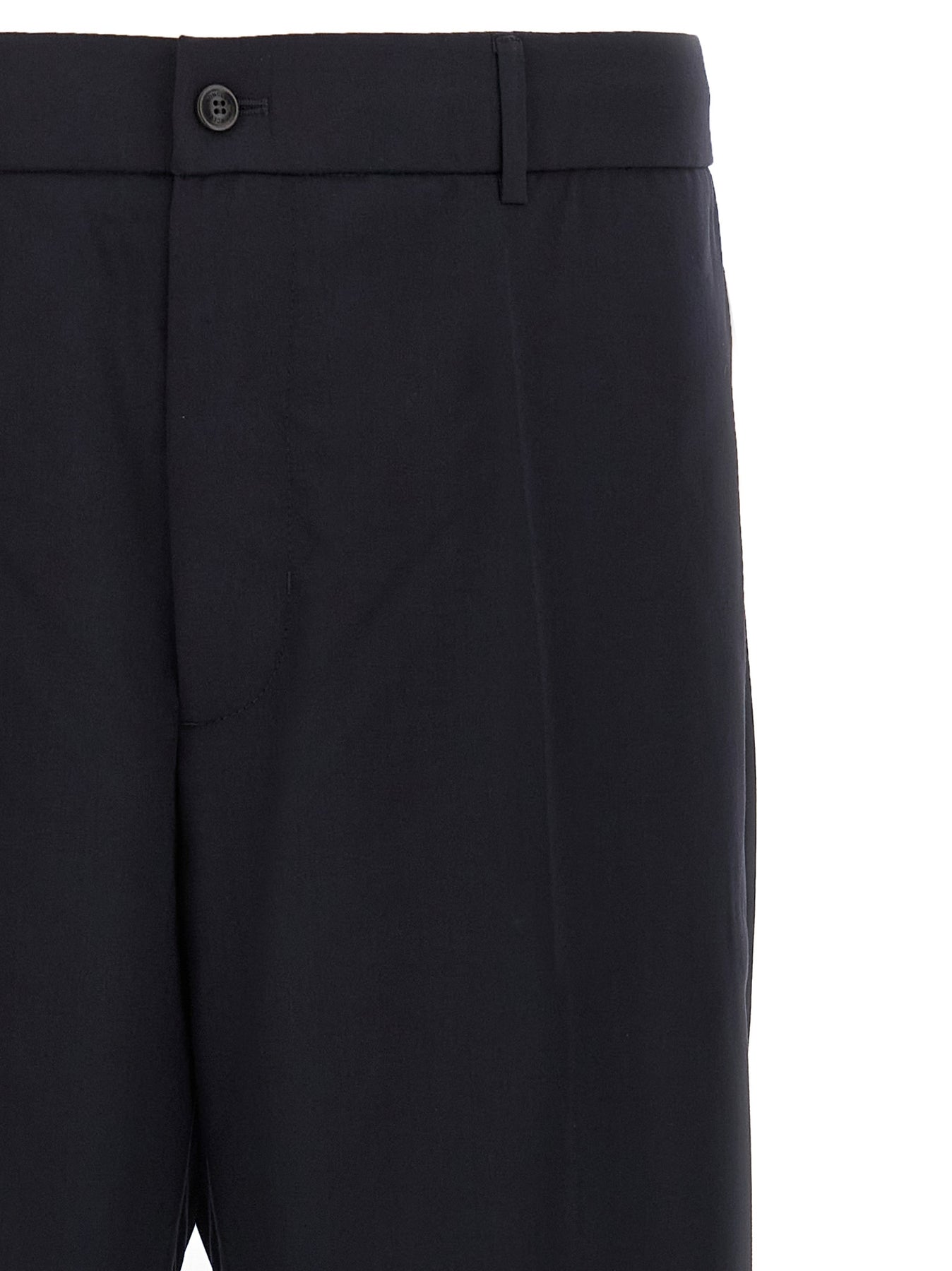 Wool blend gabardine pants, back leather logo patch, adjustable drawstring elastic at the waist, front zip and button closure, pockets, stretched pleat, straight leg.
