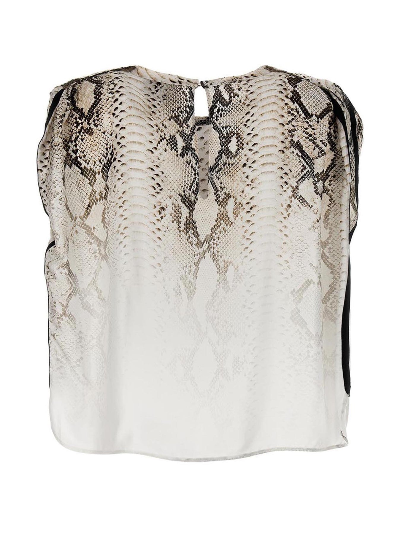 All over 'Snake' print viscose blous with crewneck, short sleeves gathered on the shoulder and contrast side bands.