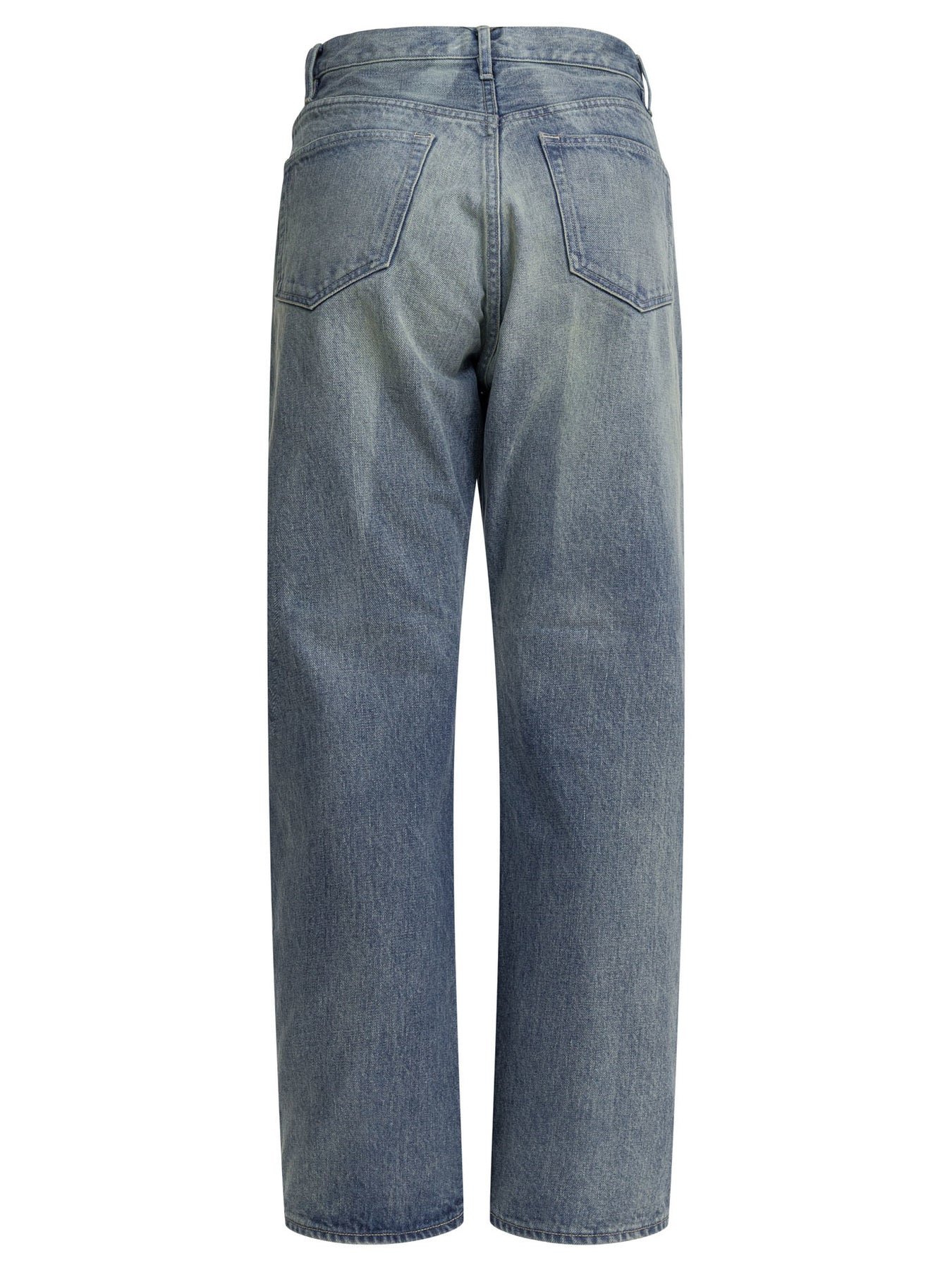 Auralee heavyweight denim jeans feature a compact construction made from a cotton fabric woven on a shuttle loom. The silhouette maintains straight lines with a soft cut, enhancing the rugged texture of the denim. Construction details include visible stitching and hand-applied finishing by skilled artisans, giving the fabric distinctive fades and surface textures related to the mode of manufacture. || - Solid color - High waist - Denim woven slowly on a shuttle loom - Hand-applied finishing - Fade finish - Depth of texture - Relaxed fit