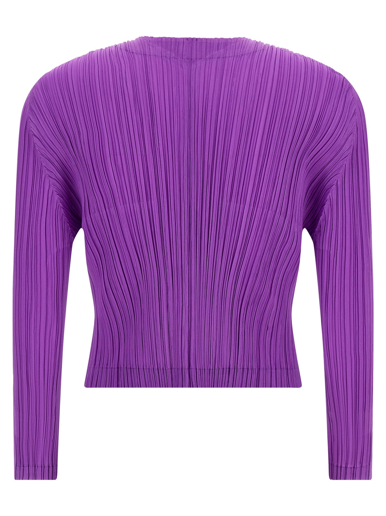 'Monthly Colors: August' pleated cardigan with round neckline, front button closure, pockets, long sleeves.