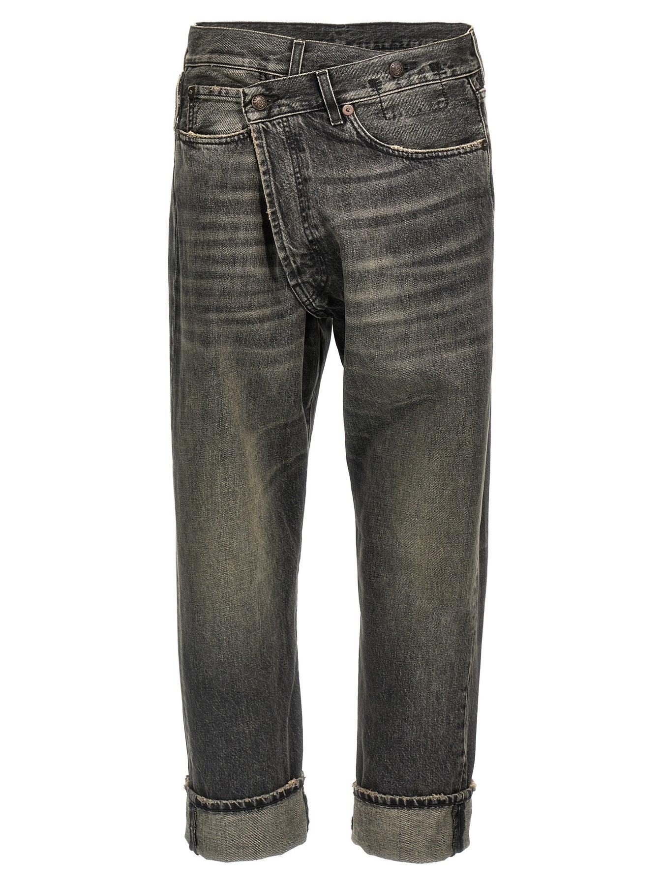'Cross Over' jeans in delavé cotton denim with asymmetric button closure, five pockets, leather logo tag, turn-up hem.
