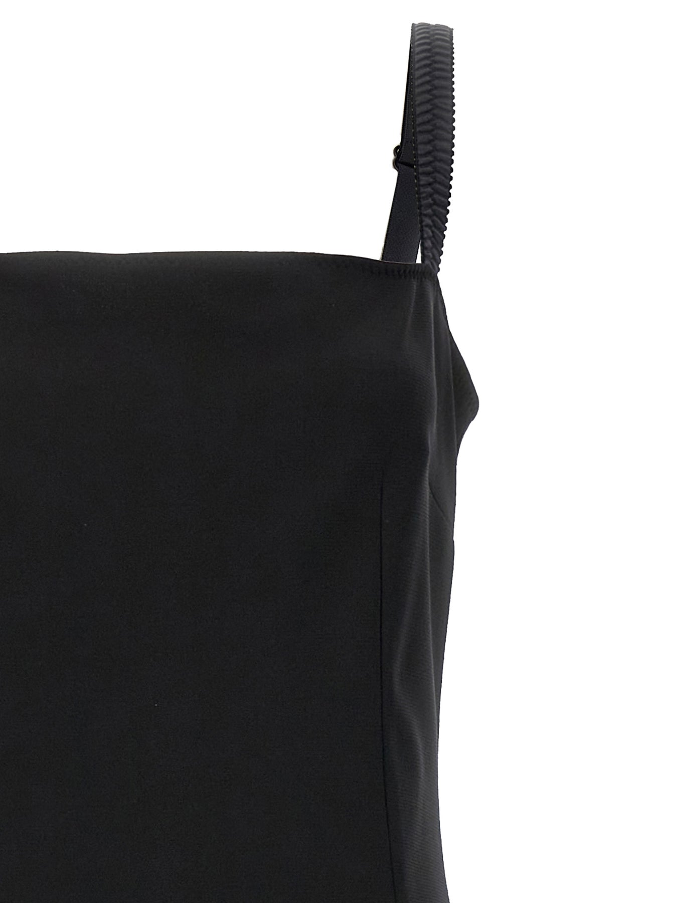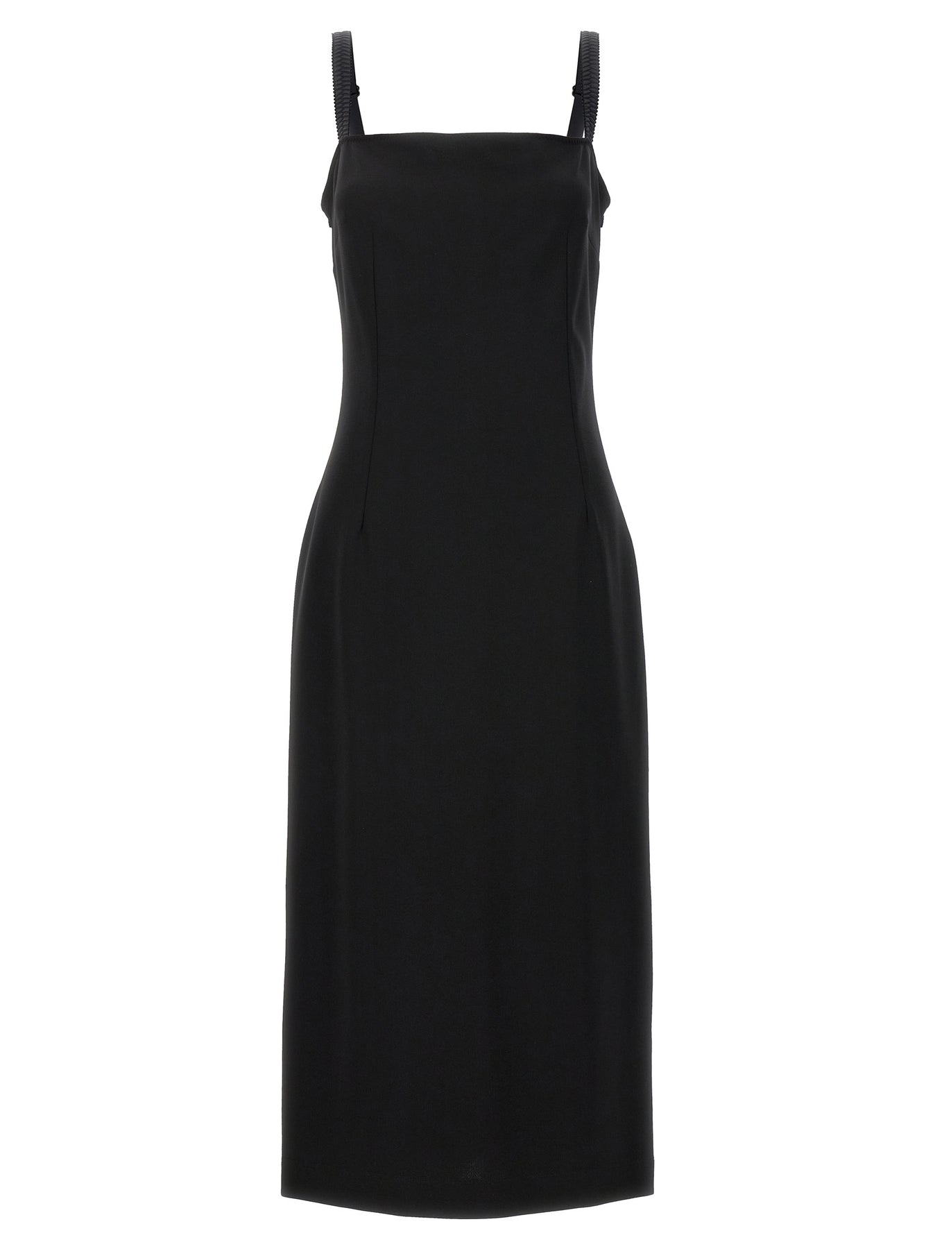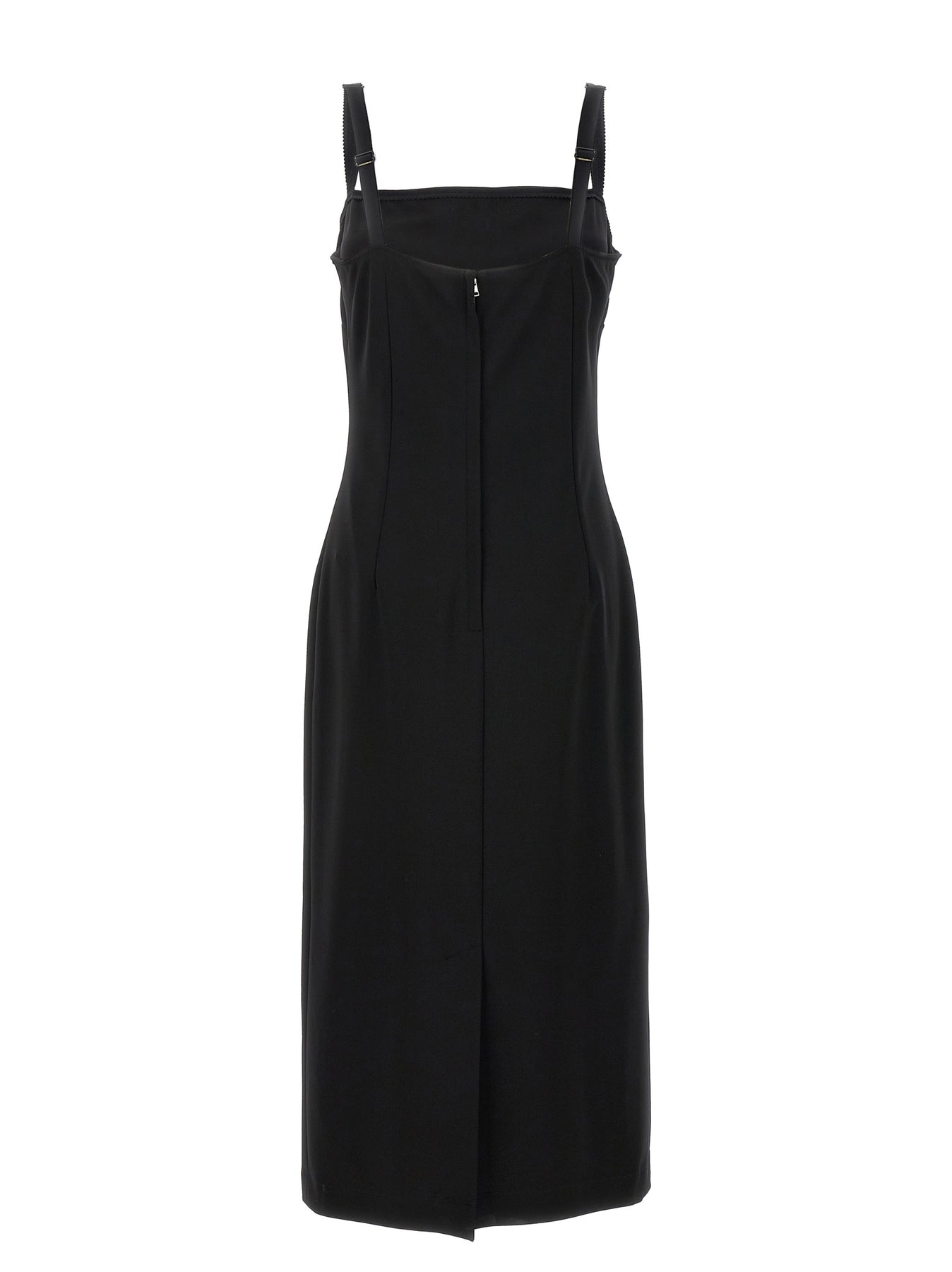 Milano stitch stretch jersey dress with square neckline, adjustable elastic straps, back zip closure, back slit.
