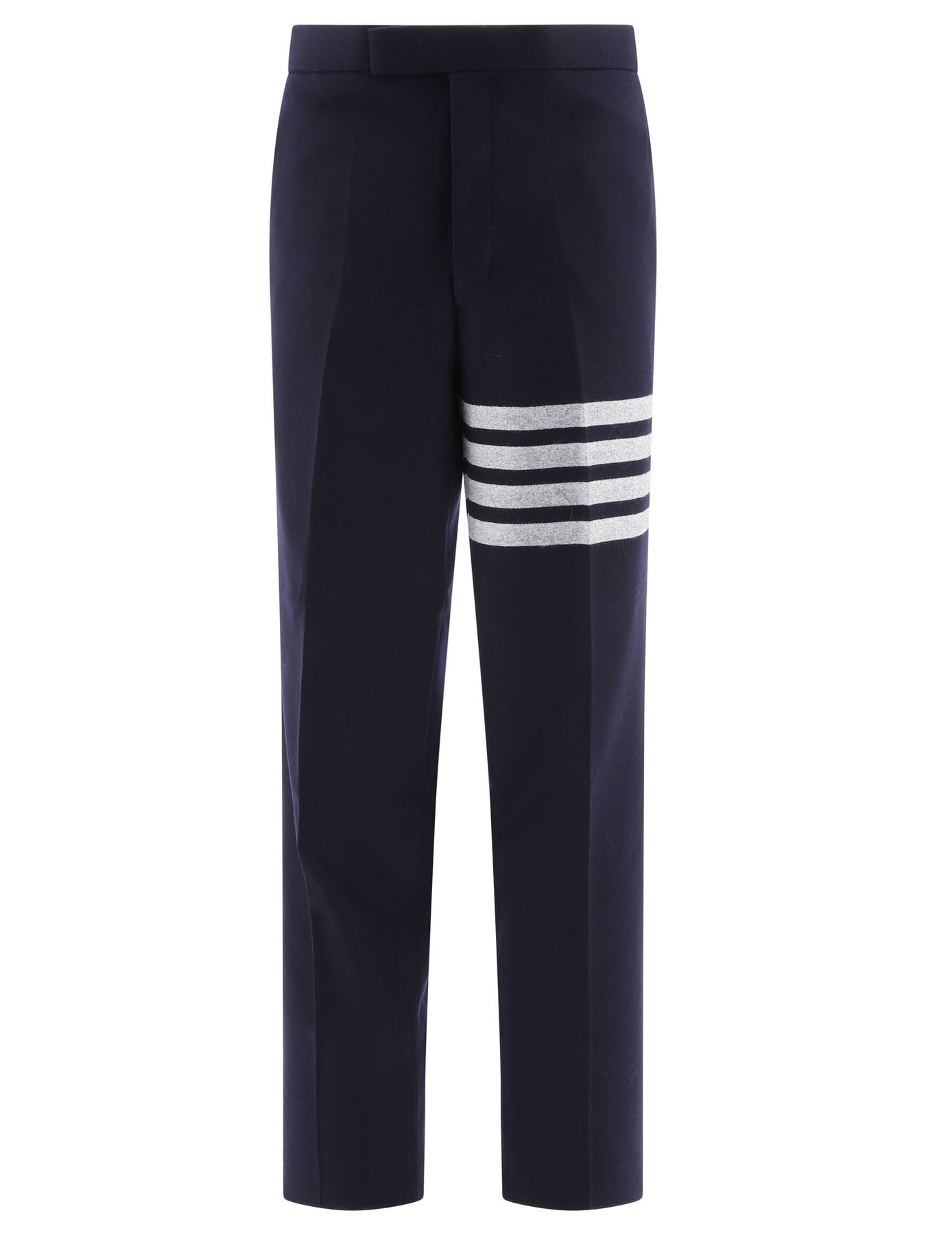 Thom Browne's "4-Bar" pants represent the essence of elegance and comfort for the modern man. The quality of the flannel used blends perfectly with the timeless and sophisticated design, making them a must-have garment for those who want to combine style and practicality. The distinctive 4-Bar detail adds an element of refined uniqueness, perfect for those who want to stand out with class. || - Regular fit - 4-Bar detail - Made of flannel - Low crotch - Hook-and-button closure - Two side pockets - Two back welt pockets fastened with a button - Adjustable back strap || These pants pair perfectly with a white shirt and a dark blazer for a flawless office look. For casual occasions, opt for a soft plain sweater and white sneakers for a touch of casual elegance.