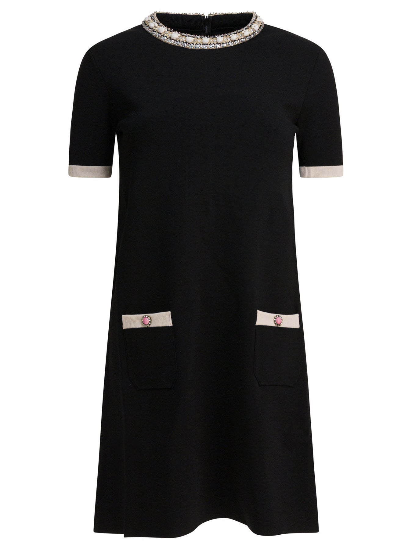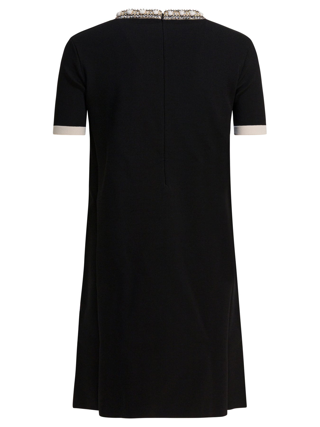 Valentino embellished crewneck dress made of viscose blend with a compact structure. The construction features a regular line and straight silhouette. The crew neck is finished with a series of applied crystals. The design features short sleeves, back zipper closure and two front pockets with jeweled button detail. The overall look is essential and defined in proportions. || - Short sleeves - Solid color - Back zipper closure - Two front pockets with jeweled buttons - Crew neck with applied crystals - Viscose blend fabric - Regular fit