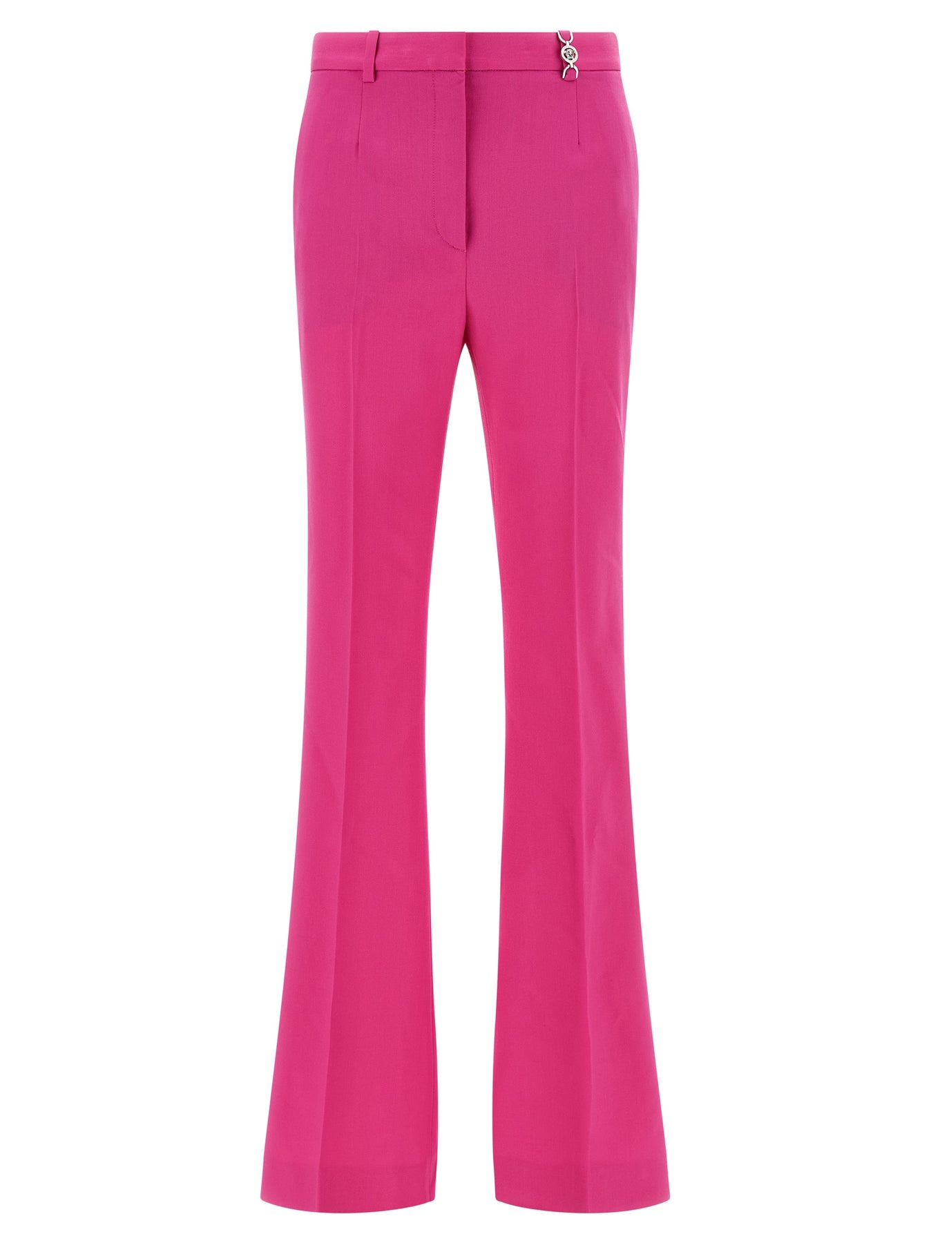 'Informal' stretch wool pants, slightly flared straight leg at the bottom, front stretched pleat, button and zip closure, metal logo details, pockets.