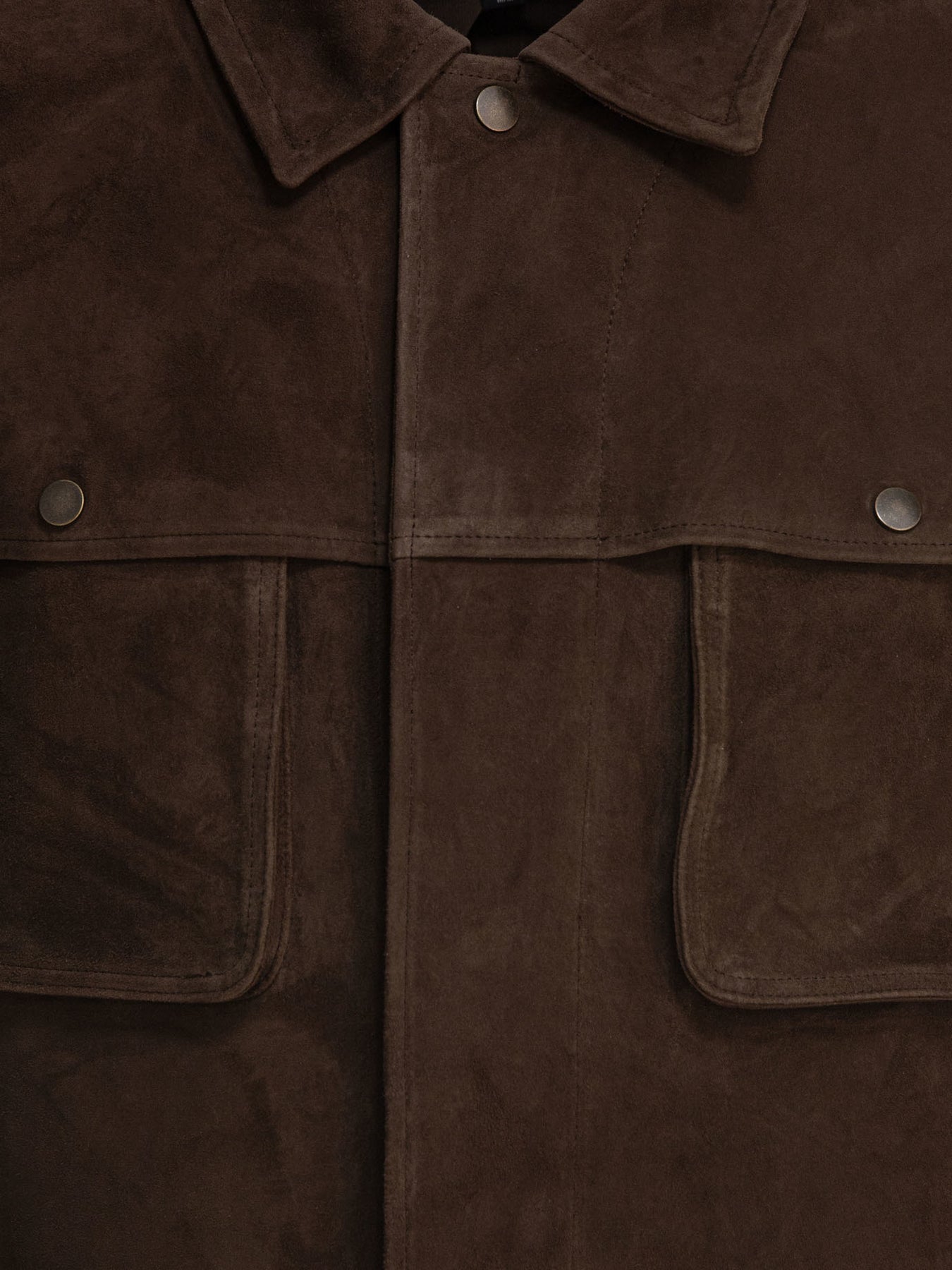 Discover Vince brand's "Hunter" suede jacket, a menswear staple that combines tradition and modernity. Made of a fine chocolate-colored suede, this jacket enhances your style with a regular fit and a design reminiscent of iconic hunting garments, perfect for the man who wants an impeccable blend of functionality and elegance. || - Solid color - Regular fit - Long sleeves - Concealed front snap closure - Lined for added quality - Side and chest patch pockets with flap and snap button closure - Reinforced shoulders at the back || To complete your sophisticated look, we suggest pairing this suede jacket with a pair of neutral-toned chino pants and a casual shirt. A pair of leather ankle boots and a leather messenger bag will perfectly complete the outfit for a flawless result.
