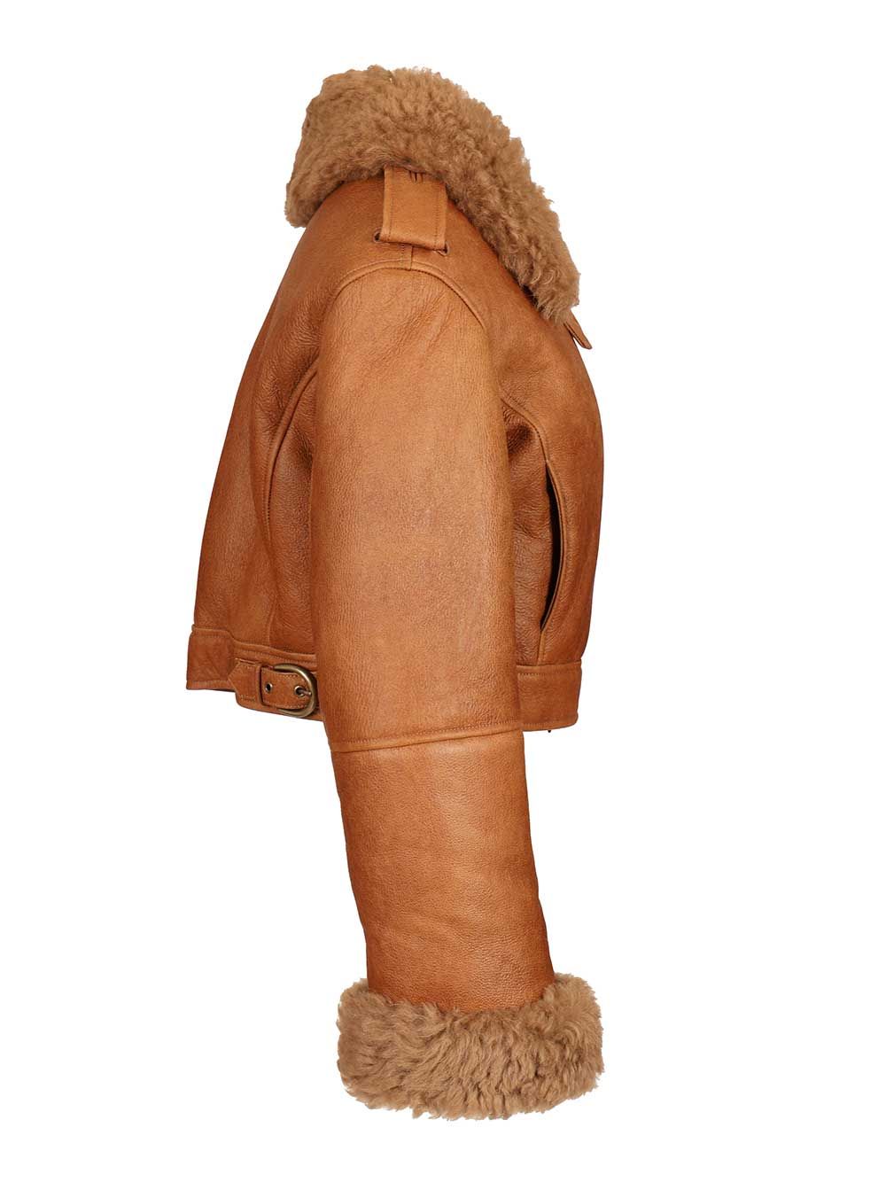 Cropped boxy jacket in Icelandic wooled sheepskin trimmed with shearling, featuring a high neck, engraved horn buttons and shoulder tabs.