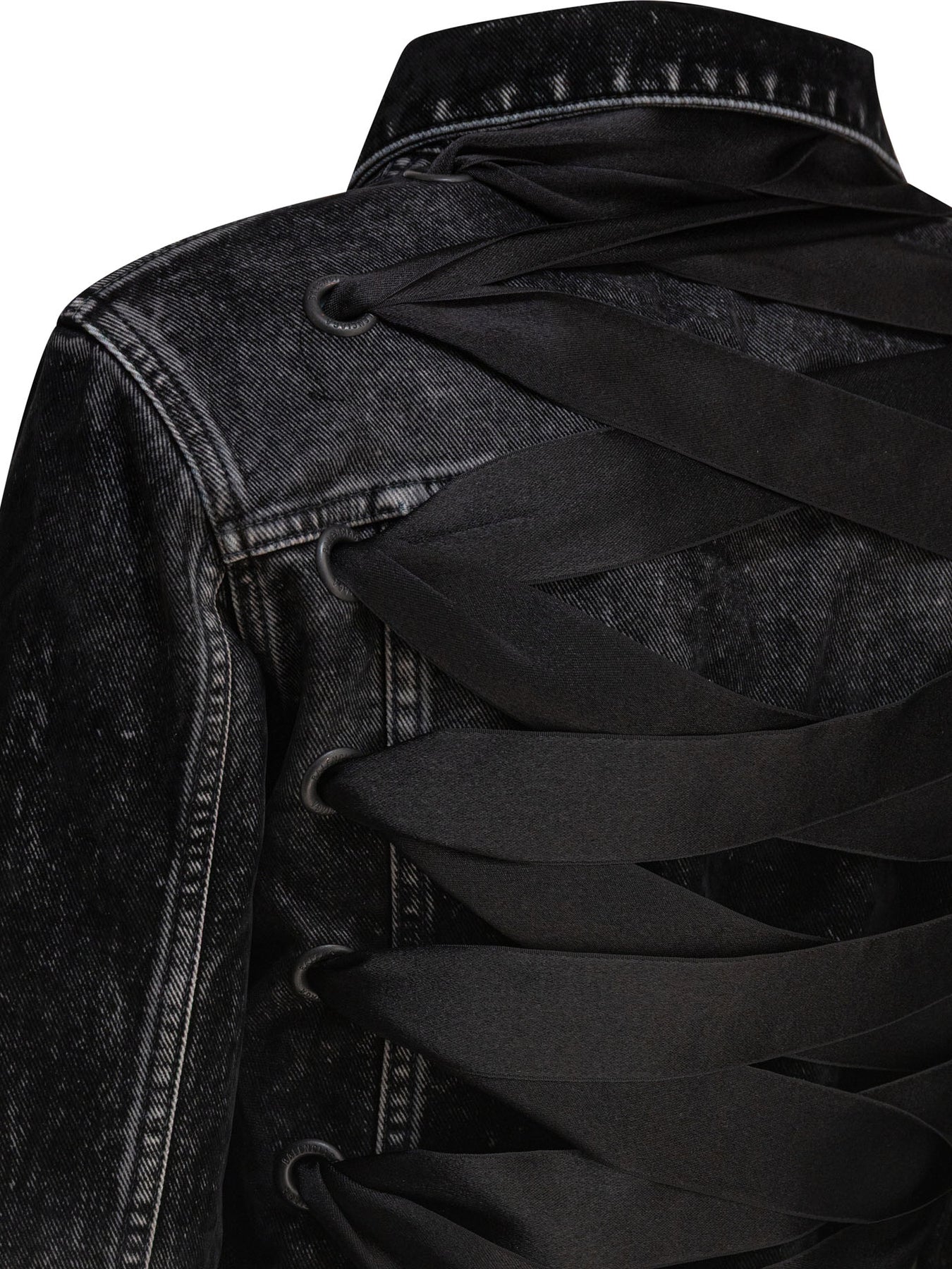 Discover the innovative essence of Balenciaga's signature denim jacket with laces, designed for the modern, confident woman. This unique garment combines style and functionality in a cutting-edge design featuring the absolute finest details, making it a distinctive choice for those who like to dare with elegance. || - Denim - Long sleeves - Slim fit - Full back lace-up style - 5 buttons on the front - Two buttoned breast pockets - Environmentally sustainable product || Imagine walking around town, wearing this Balenciaga denim jacket paired with faux leather pants for an urban chic look.You can complete your outfit with a structured bag, creating a style that speaks of personality and attention to detail. Also perfect for informal evenings, this jacket can be adapted to a variety of situations, giving you a sophisticated look with a strong character.