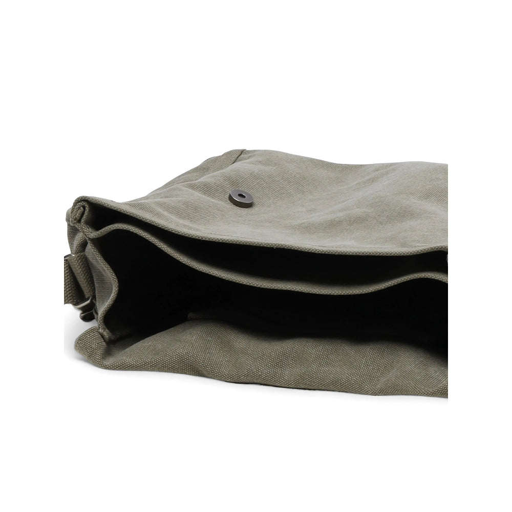 khaki cotton canvas silver-tone hardware embroidered logo to the front logo-engraved buttons foldover top with press-stud fastening single top handle adjustable shoulder strap two side flap pockets slip pocket to the front main compartment internal zip-fastening pocket