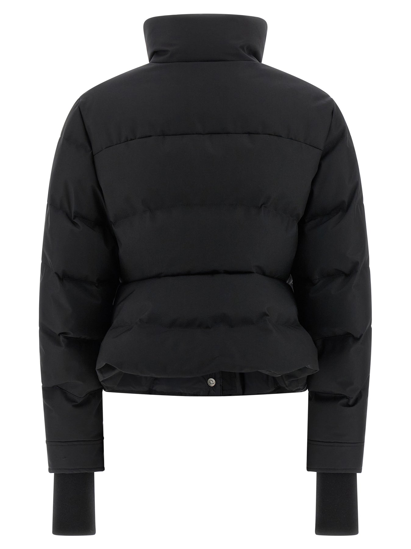 Quilted and goose feather padded technical fabric down jacket, crop style with hourglass silhouette, standing collar, zip and snap button closure on the front, pockets, long sleeves with knitted cuffs and tone-on-tone embroidered logo, slightly ruffled hem.