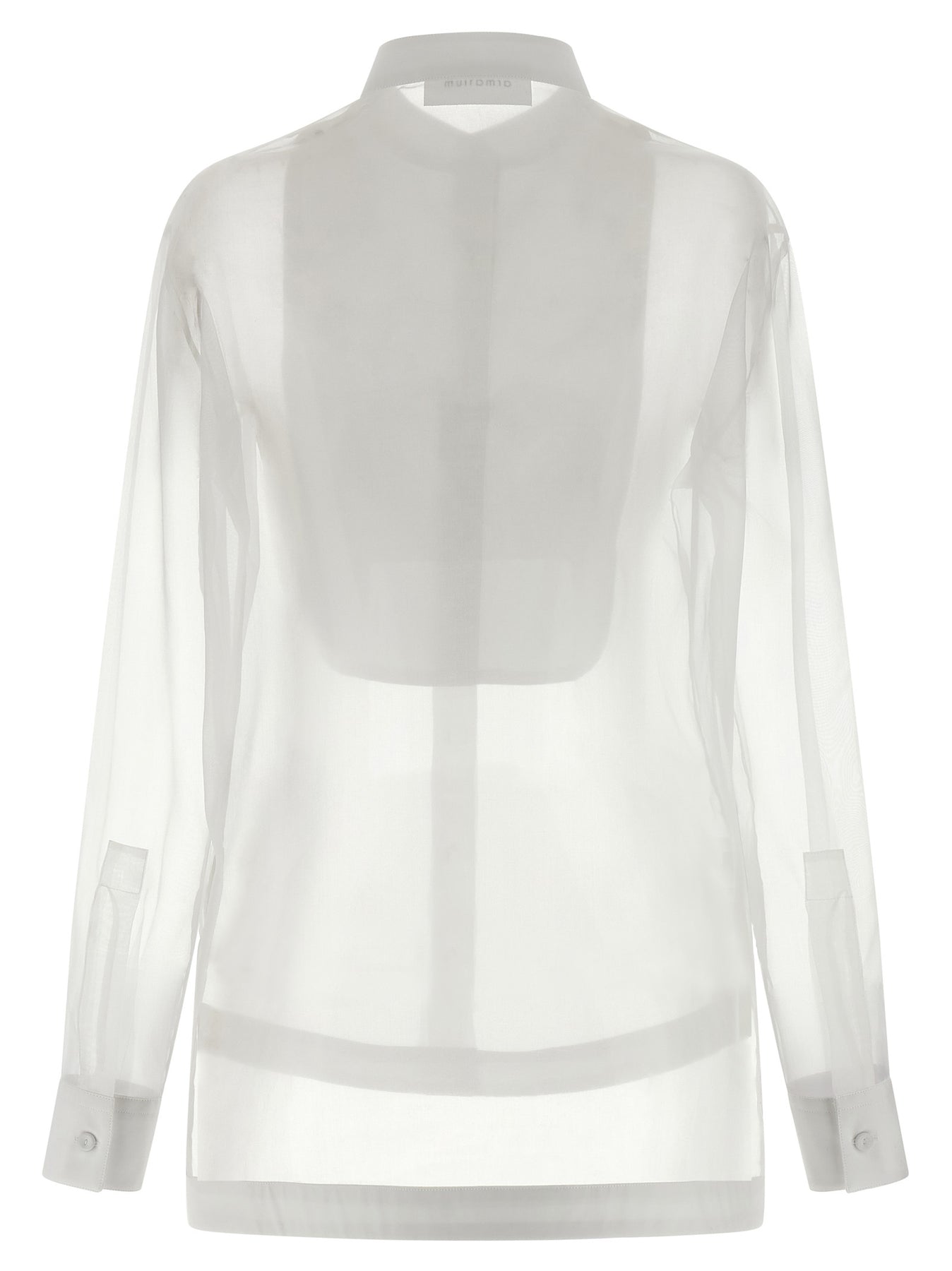 'Prisca' semi-transparent silk organza shirt, tuxedo model, double plastron in cotton poplin, mandarin collar, front button closure, long cuffed sleeves, asymmetric hem, side slits.