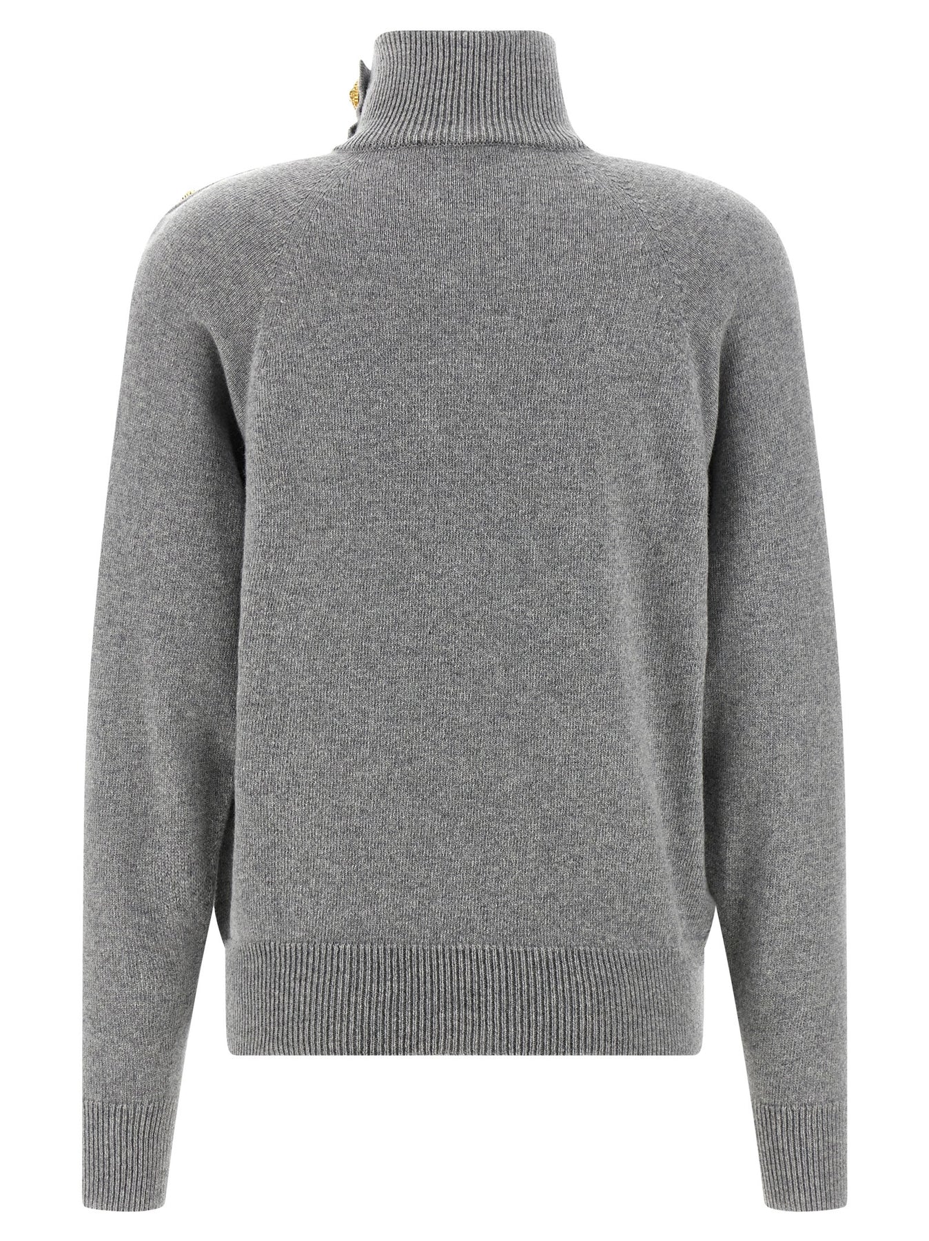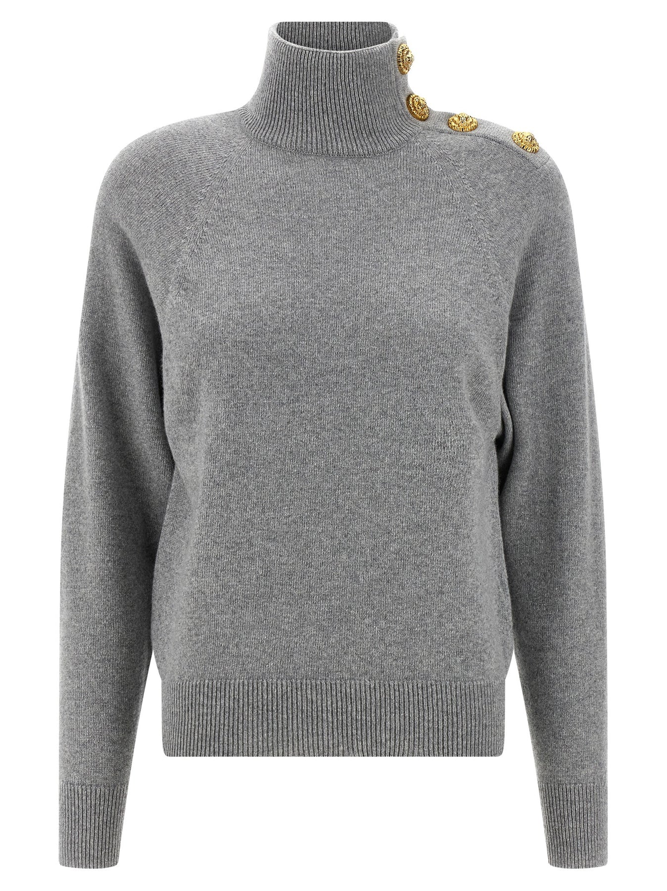 Wool and cashmere sweater with high neck, metal 'Testa di leone' button detail on the left shoulder, long bat sleeves with cuffs.
