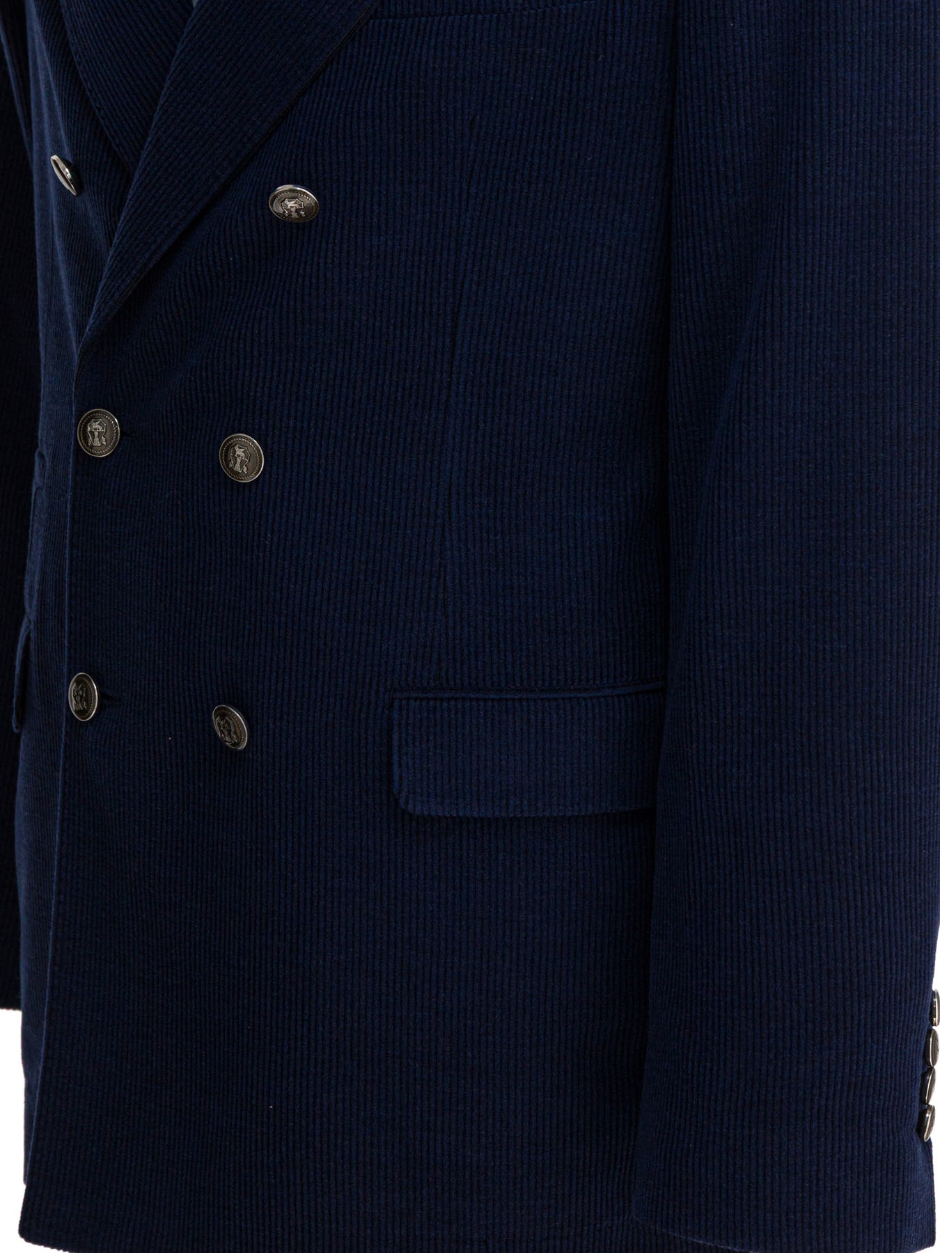 Brunello Cucinelli wool, silk and cashmere double-breasted blazer. The deconstructed structure features a one-and-a-half-breasted line in corduroy, with no padding. The weave combines wool, silk and cashmere fiber, creating a smooth, flowing surface. The Solomeo shoulder, characterized by a dry profile and defined proportions, gives a sharp, dry silhouette. Metal buttons complete the construction. || - Corduroy in 77% wool, 20% cashmere, 3% silk - Deconstructed construction without padding - Metal buttons - Solomeo shoulder with dry cut - Double-breasted closure - Regular fit