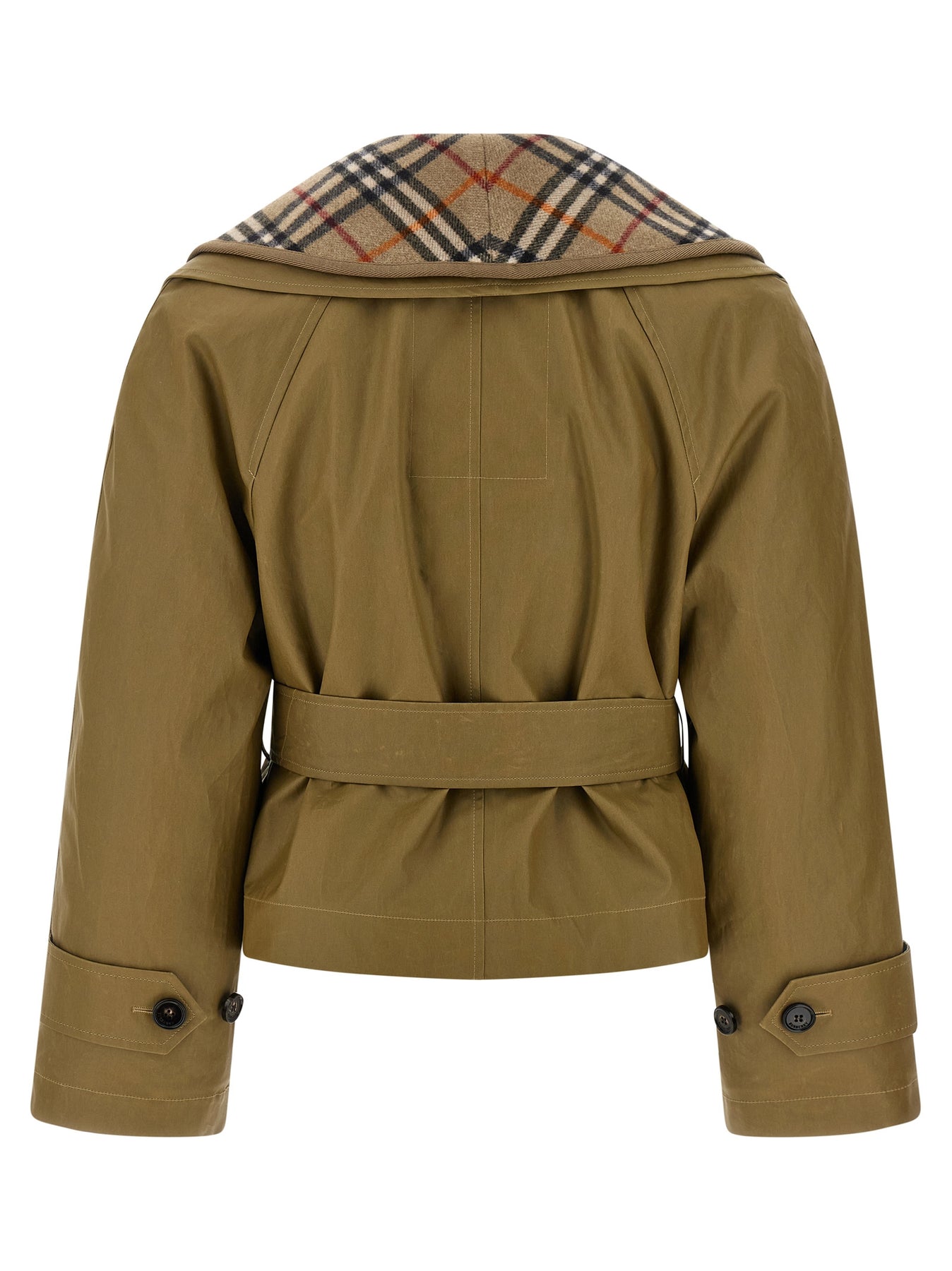 Burberry Check waxed cotton 'Carlton' jacket with detachable wool quilting that creates a contrasting shawl effect on the front, crop style, shawl collar, front button closure, pockets, long sleeves, belt with removable B-shaped metal buckle.