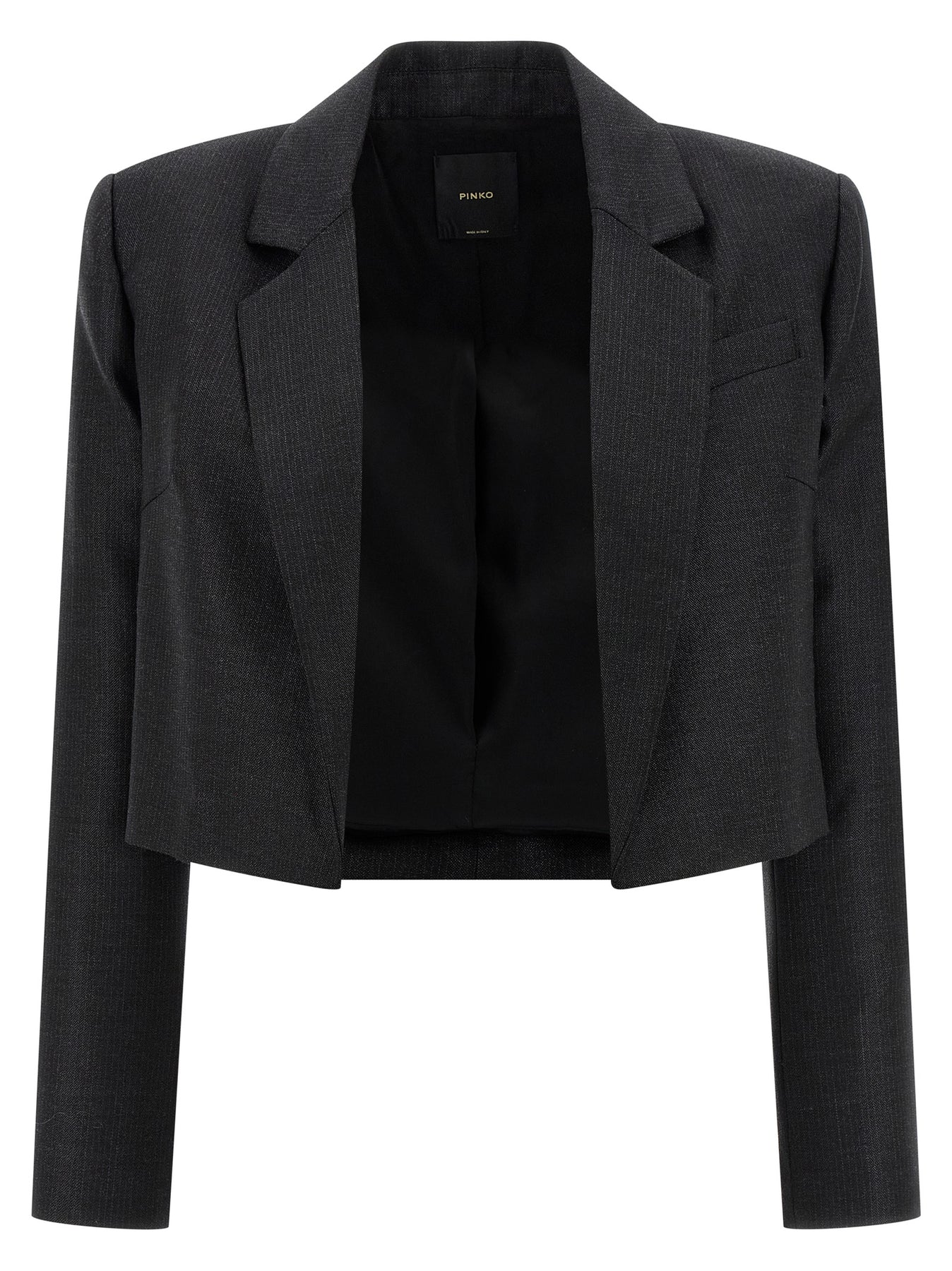 'Eliana' blazer in wool blend canvas worked with thin metallic thread with pinstriped effect, Spencer cut, mirror lapels, chest pocket, padded shoulder, long sleeves, lining.
