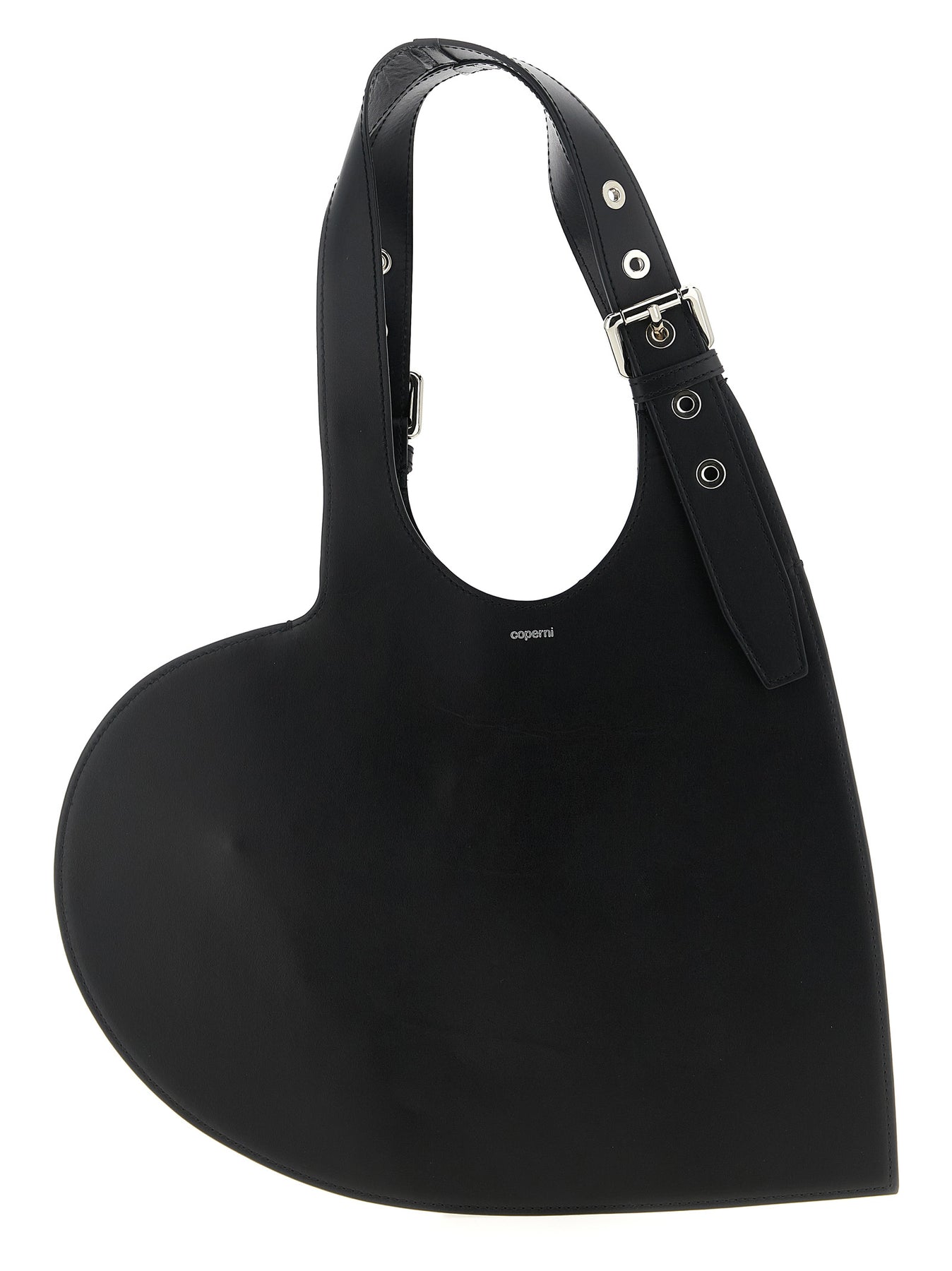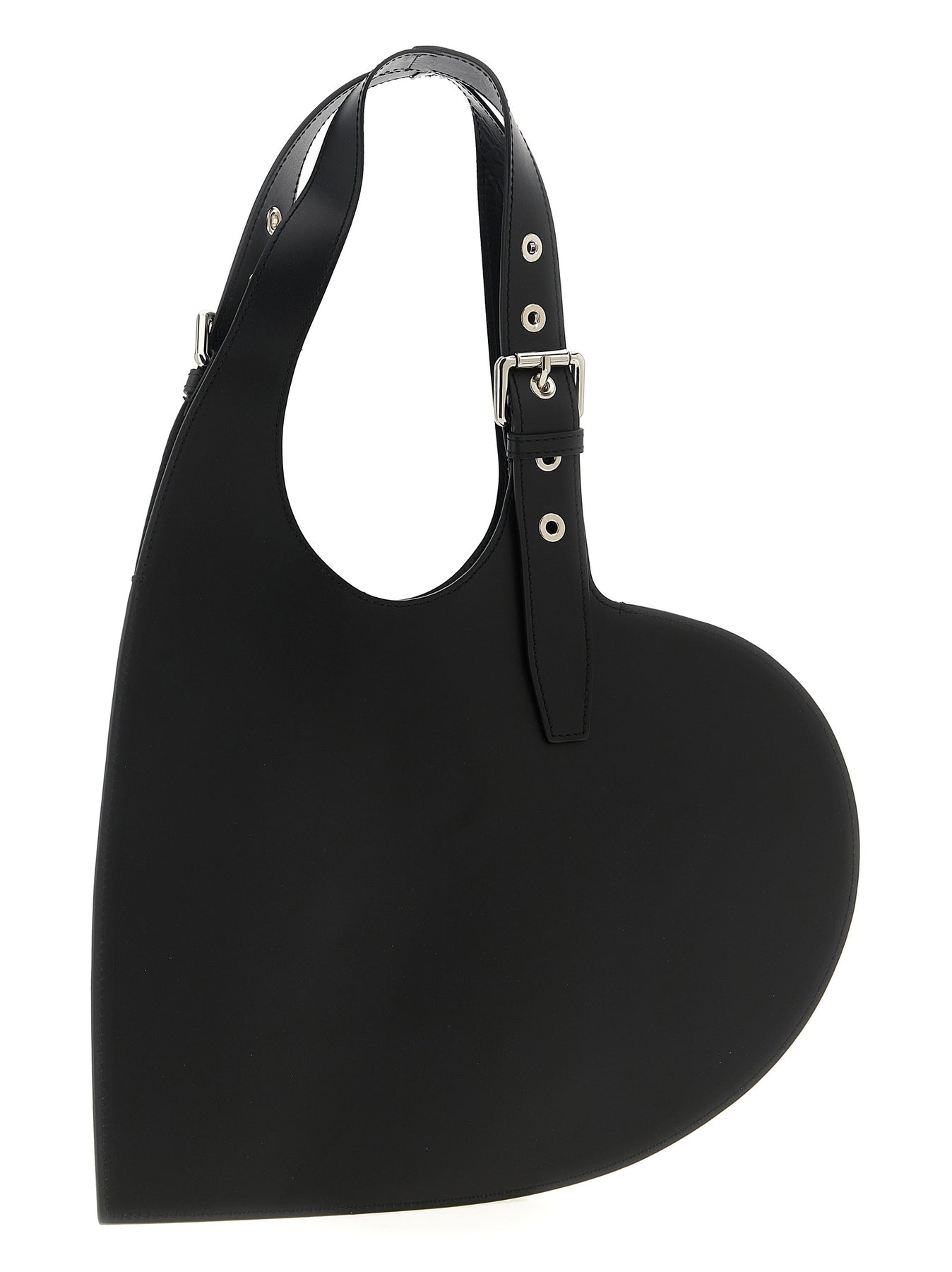 'Belt Heart' shoulder bag in smooth leather, heart-shaped model, front embossed logo, adjustable handle, metal details.