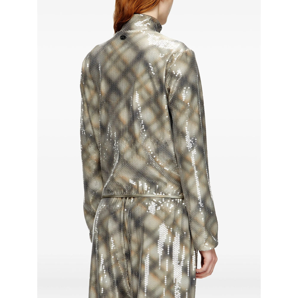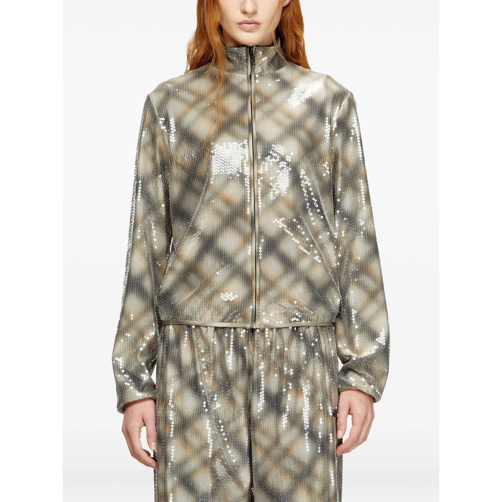 beige and grey checked pattern embellishment detail zip fastening high neck