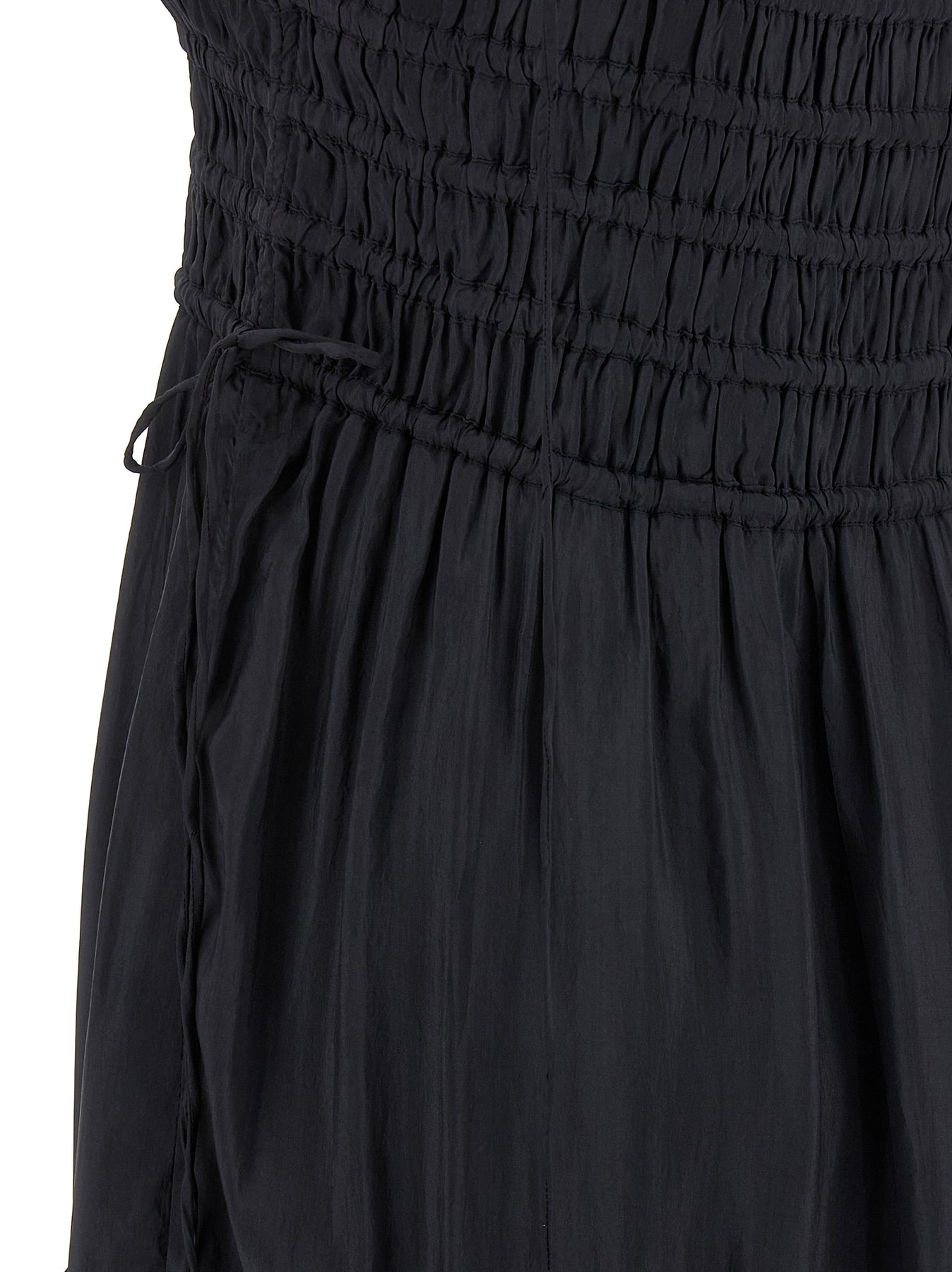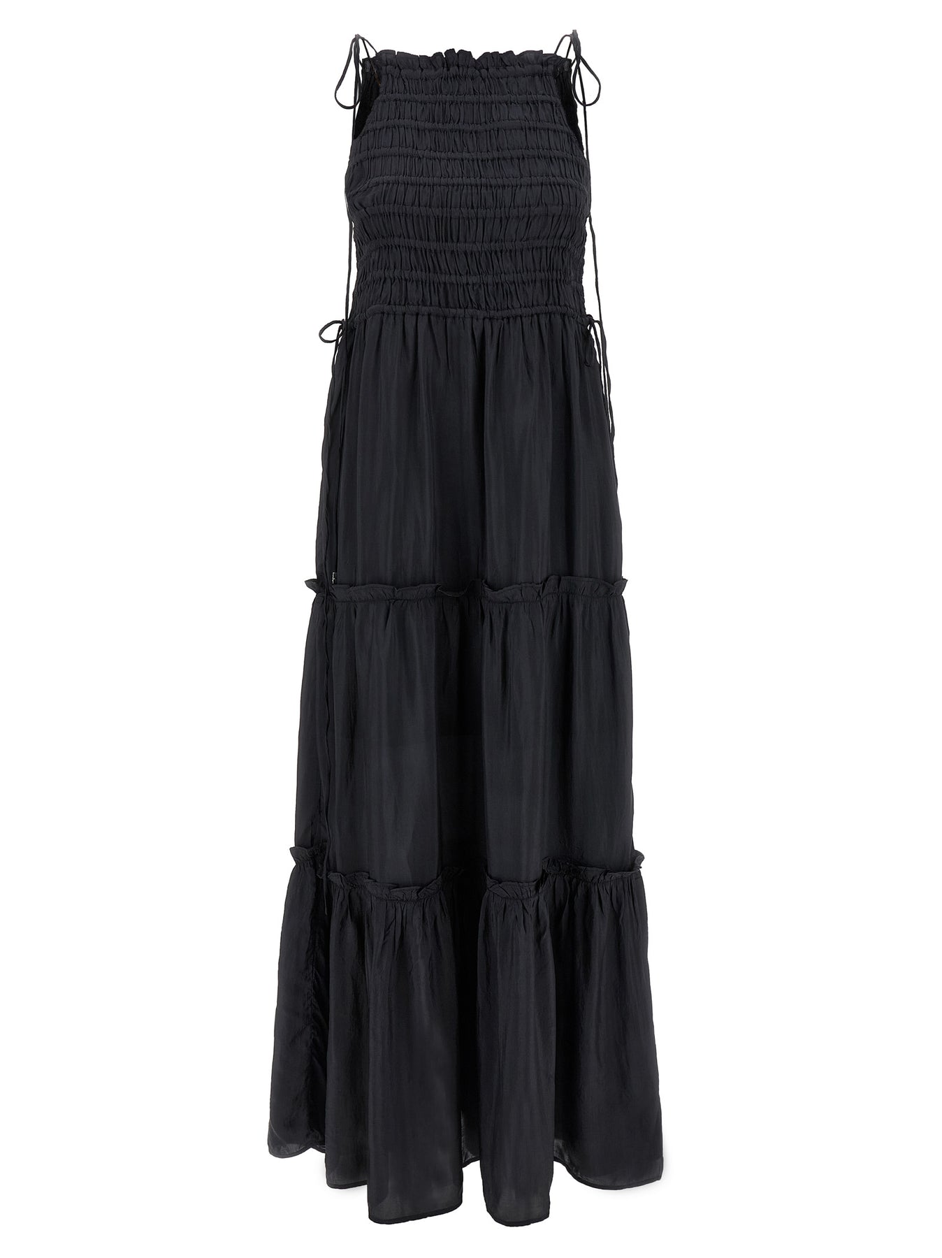 Long viscose dress Black Smock Tie with American-style neckline, smock stitch top, sleeveless with thin adjustable laces, drawstring at the waist, and layered wide skirt.