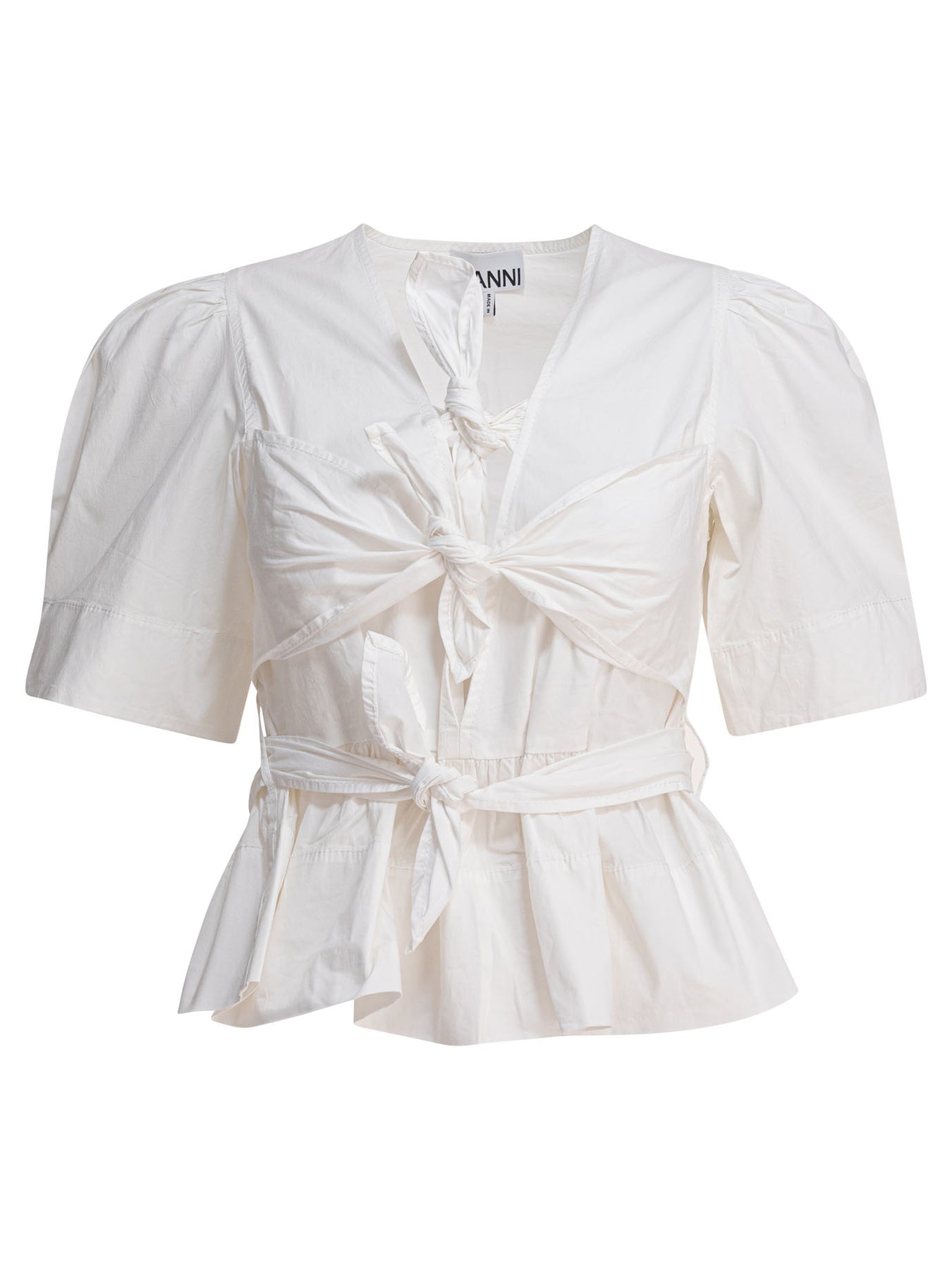 Discover the ruffle blouse from Ganni, a versatile garment designed to enhance femininity and add a touch of elegance to your wardrobe. Made of stretch cotton, this blouse combines comfort and style, proving ideal for the woman who loves to stand out with modern and sophisticated elegance. || - Deep V-neckline - Short and puff sleeves - Three bows on the front - Regular fit || For a flawless look, pair this blouse with a pair of wide-leg pants and high heels for an elegant evening out. Or, for a more casual outfit, wear it with boyfriend jeans and ankle boots. Complete it with a leather shoulder bag for a classy touch.