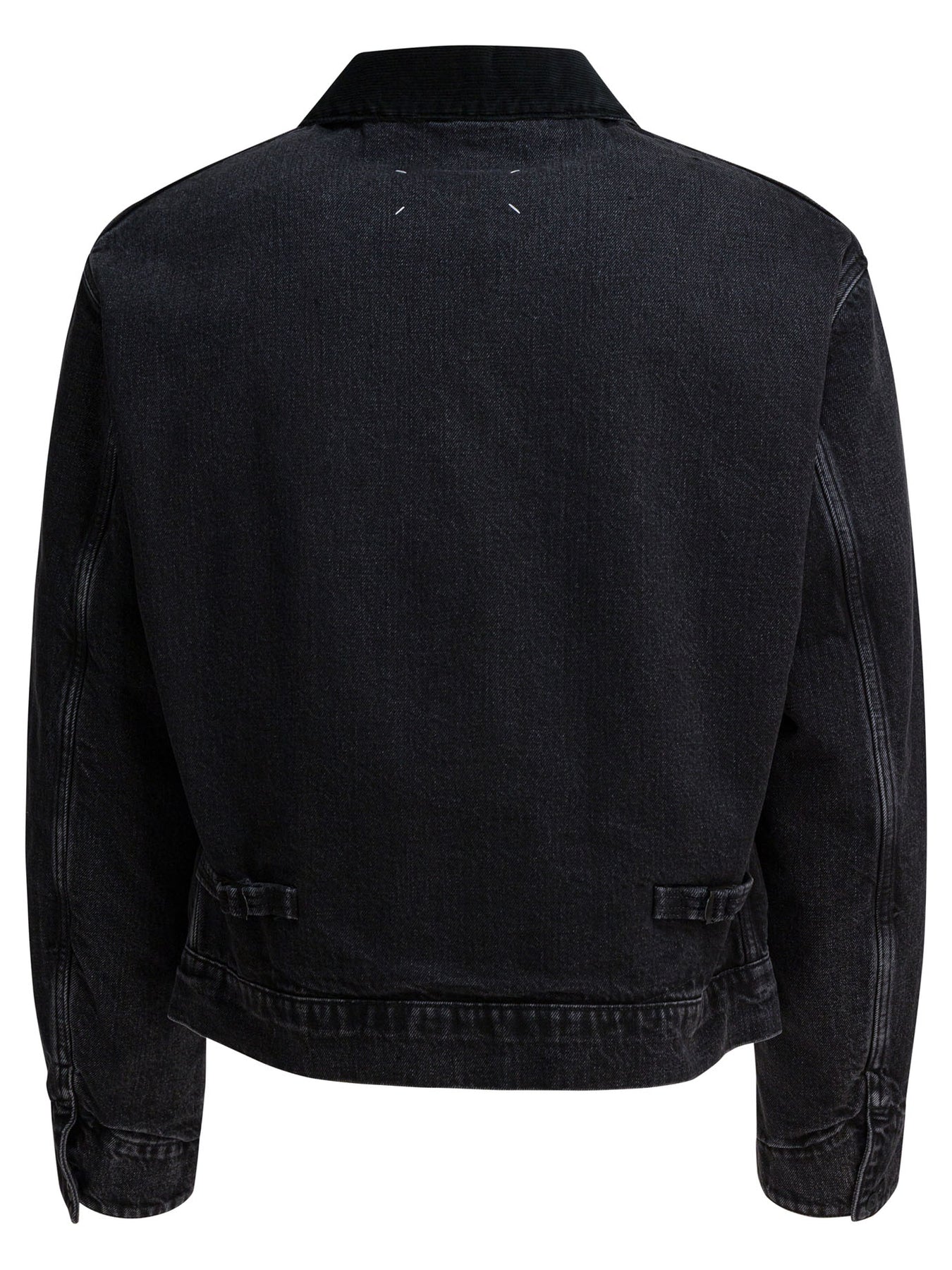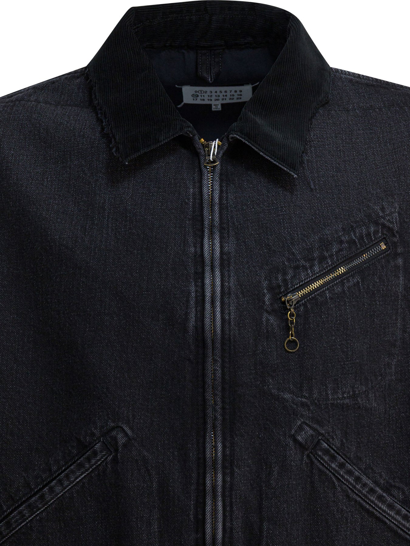 Maison Margiela denim jacket made from Japanese cotton denim. Features a workwear-inspired silhouette with contrasting corduroy collar and raw edge. Front zipper closure. There are two slanted welt pockets and a zippered chest pocket with metal ring. The back features the brand's distinctive four stitches. || - Solid color - Japanese cotton denim - Contrasting corduroy collar - Front zipper closure - Two slanted welt pockets - Chest pocket with zipper and loop - Four stitches on the back - Boxy fit