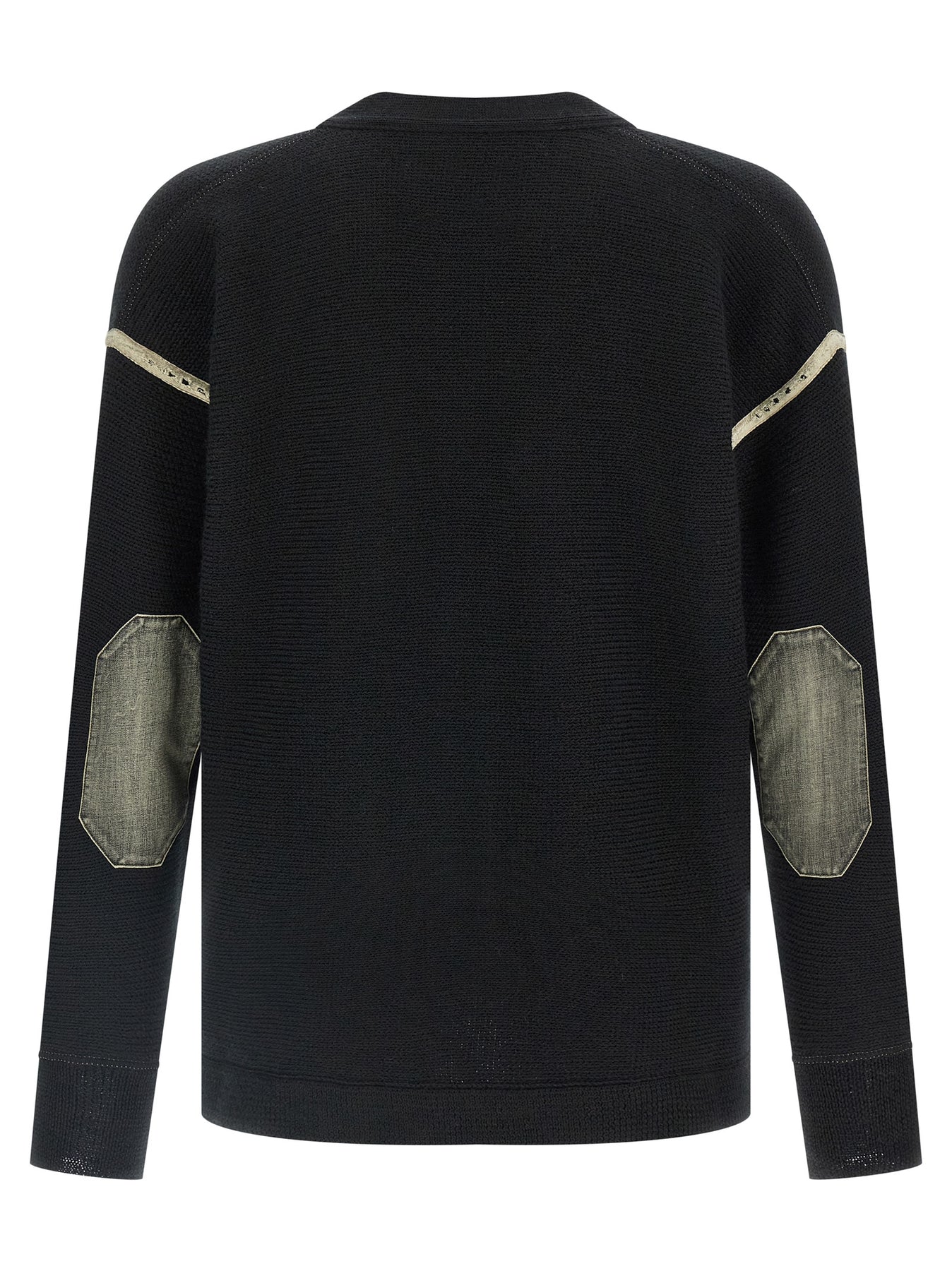 Virgin wool cardigan with V-neck, front button closure, long cuffed sleeves, dropped shoulder, contrasting used-effect cotton detail, and stonewashed cotton denim elbow patch. This product has been made with craftsmanship that makes it a unique piece. Slight imperfections and slight differences between one garment and another are, therefore, to be considered normal and a guarantee of craftsmanship of the product.