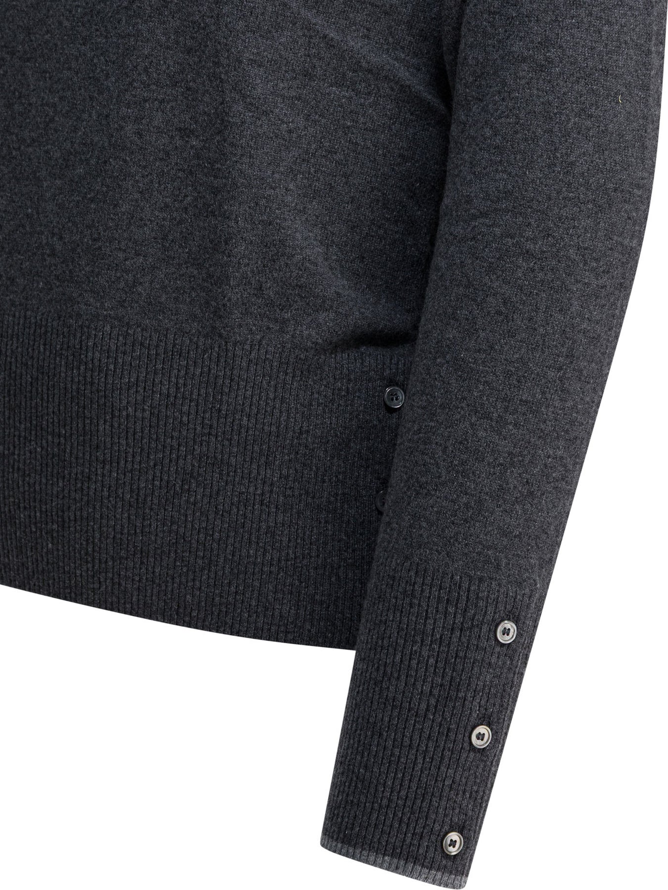 A Thom Browne "Browne 65" polo shirt, made from cashmere, features a compact fine-knit construction. The garment displays a regular, straightforward silhouette defined by the partial front button closure. The collar is integrated into the construction, while lettering in university font appears at the front. Side splits and cuffs are complemented by striped grosgrain trim with a button closure, ring tab at the back. || - Browne logo and number 65 in university font - Long sleeves - Partial front button closure - Buttoned side slits with striped grosgrain trim - Buttoned cuffs with striped grosgrain trim - Regular fit