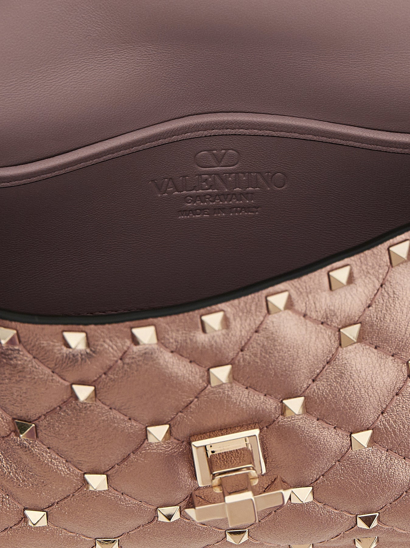 Small 'Rockstud Spike' shoulder bag in laminated nappa leather with all-over stud applications, flap closure and metal swivel, removable handle, removable chain shoulder strap.
