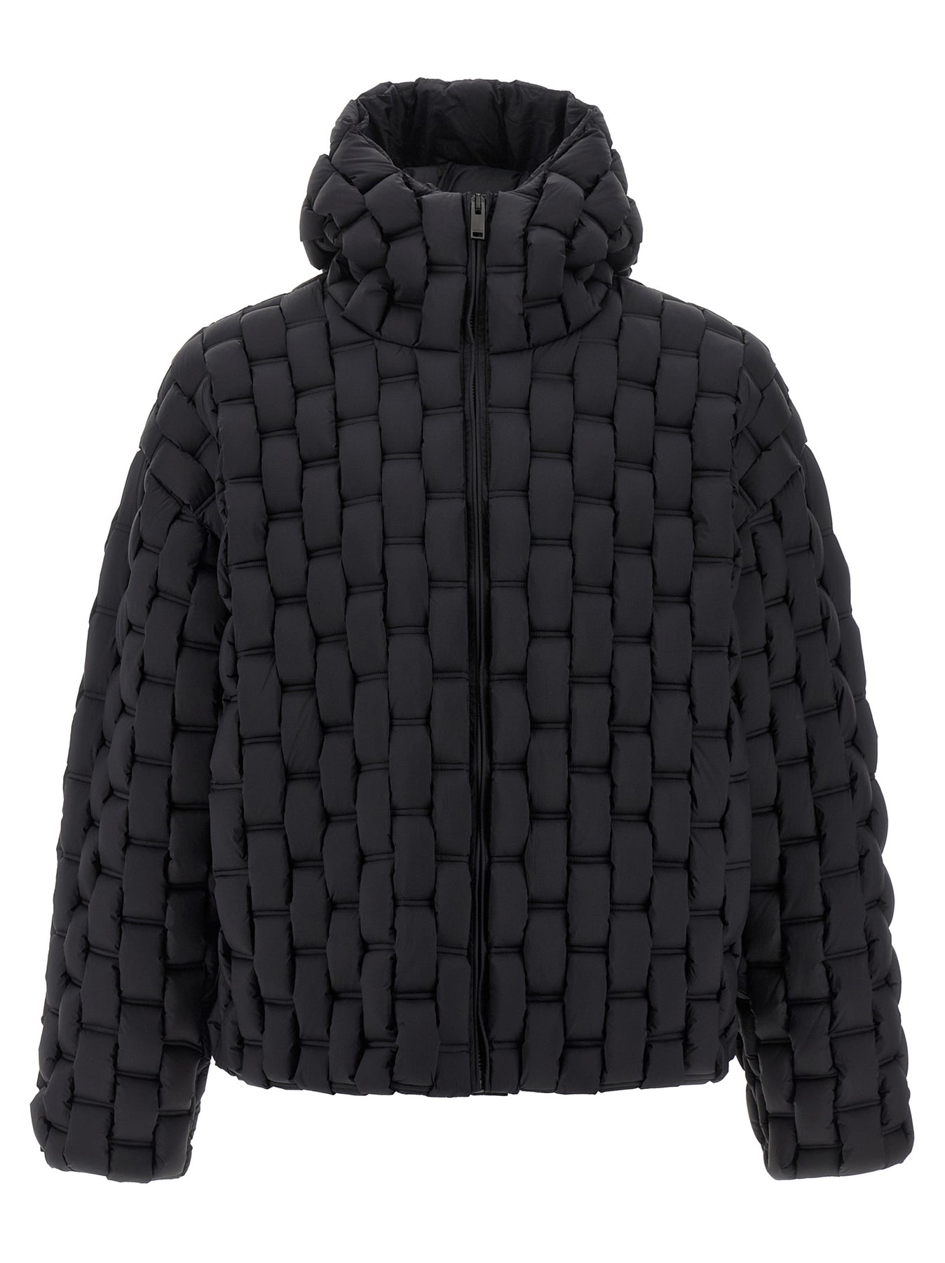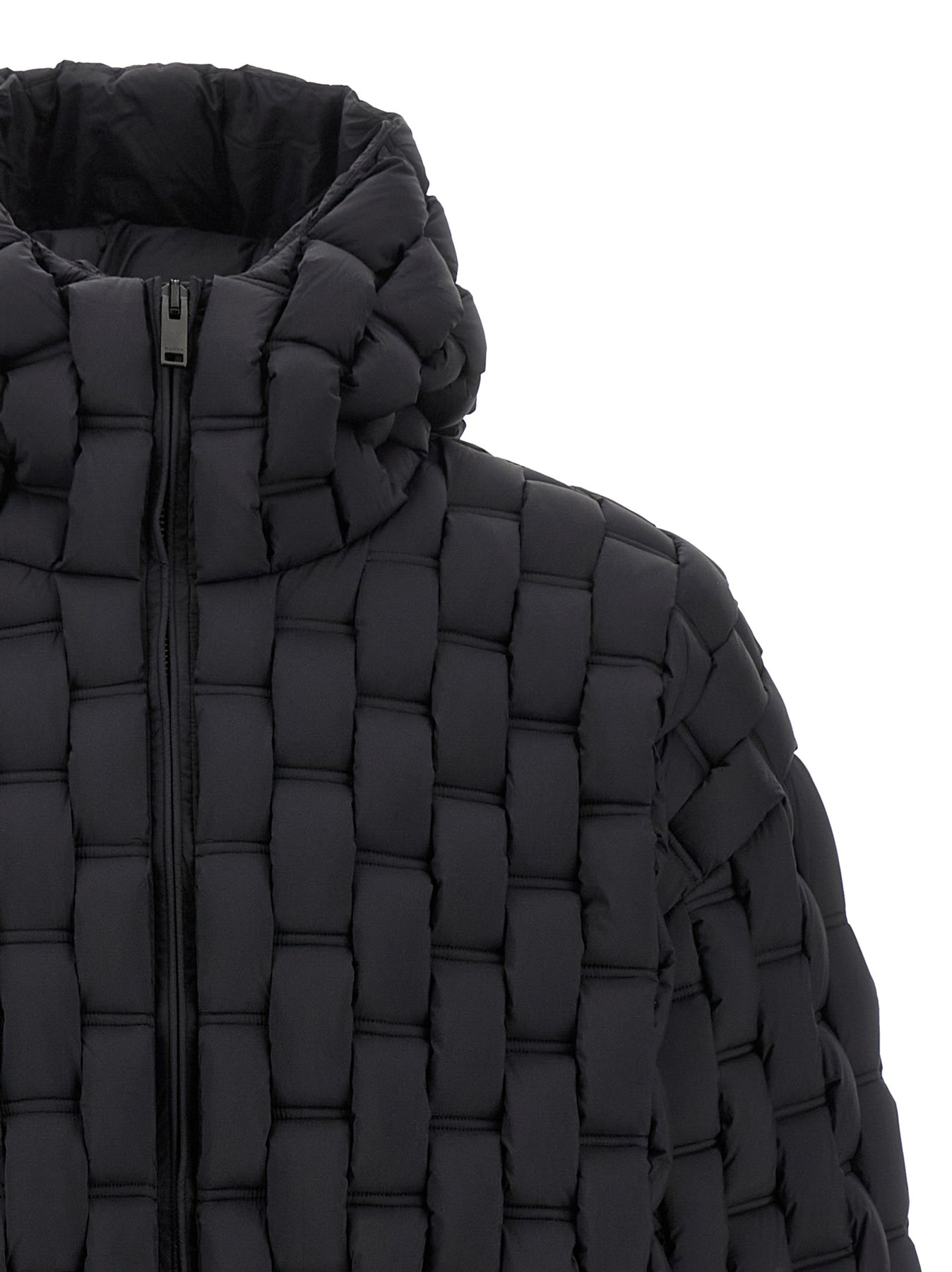 Nylon down jacket with 3D structure braided and goose feather padding, hood, high neck, front zip closure, pockets, long sleeves.