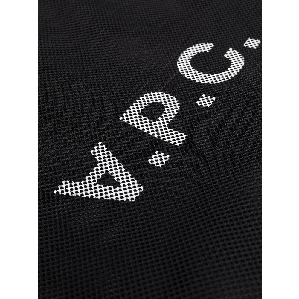 logo-print mesh tote bag from A.P.C. featuring black/white, logo print to the front, mesh detailing, two top handles and main compartment.