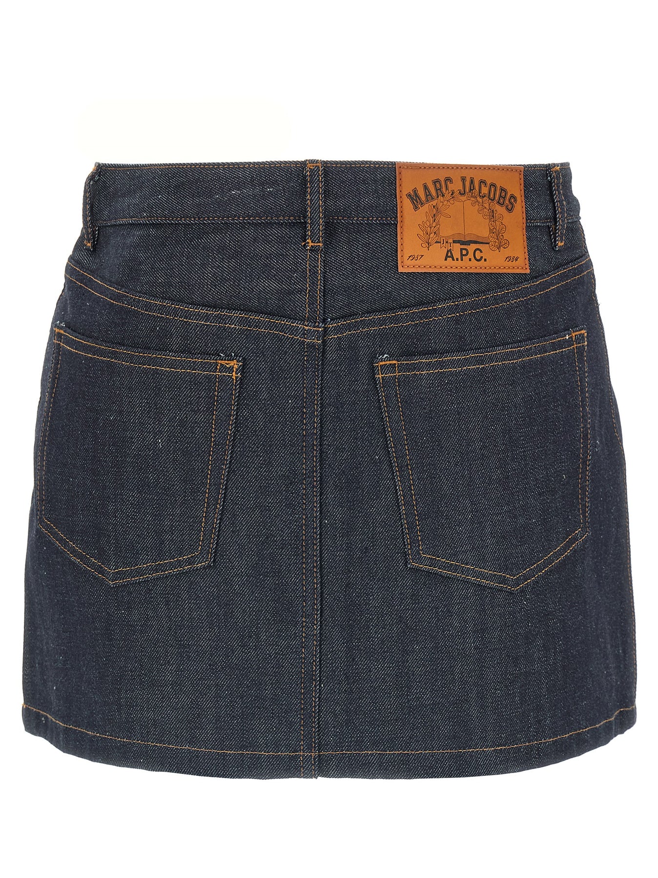 A.P.C. x Marc Jacobs capsule The Skirt mini skirt in hard cotton denim with contrast stitching, logo embroidery, front zip and button closure, five pockets, and unlined back leather logo tag.