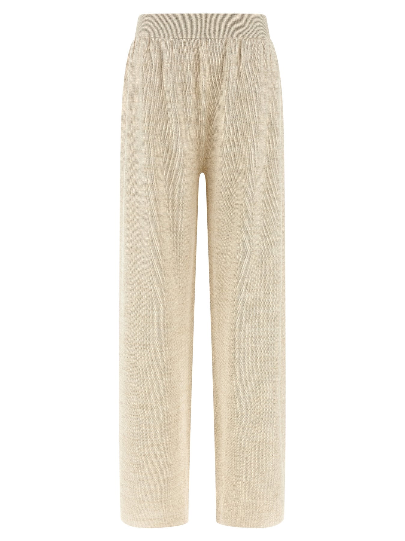 Cotton blend and viscose trousers woven with lamé thread, elastic waistband, wide and straight leg.