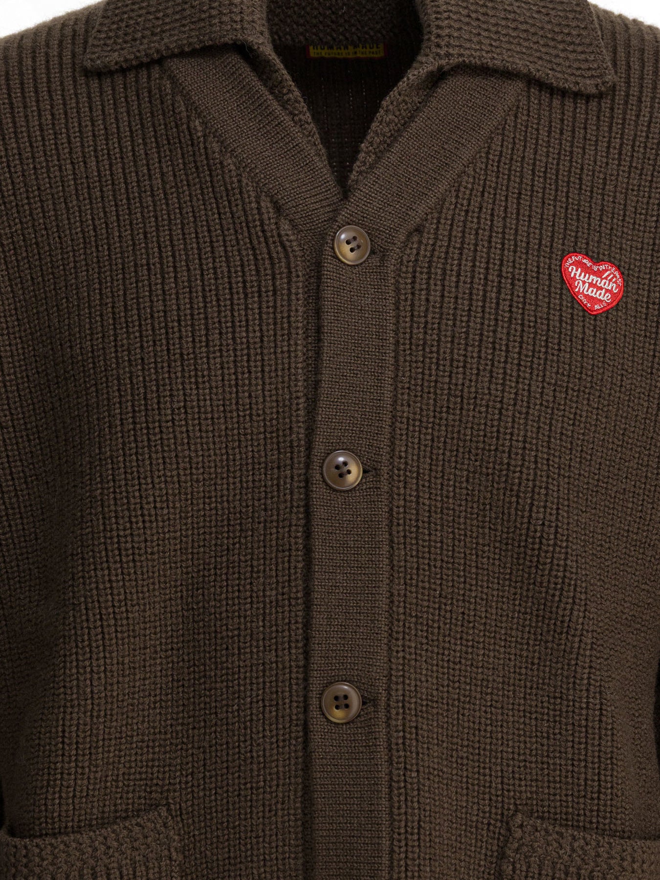 Human Made wool cardigan made of shaved knit with a soft texture. The garment features a compact construction with a removable collar applied by snap buttons. There are two patch pockets on the front and a heart-shaped patch sewn on the left chest. The sleeves are long and feature a wide line, completing a relaxed and regular silhouette. || - Heart-shaped logo applied on the chest - Long, wide sleeves - Removable collar with heart-shaped button closure - Two patch pockets on the front - Front button closure - Regular fit