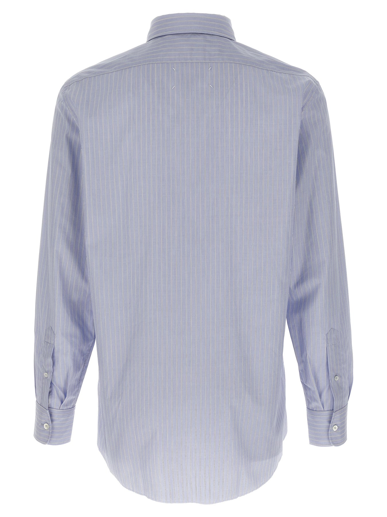 Striped cotton poplin shirt, chest pocket, front button closure, long sleeves with cuffs, raw cut hem and 'Four Stitches' at the back.