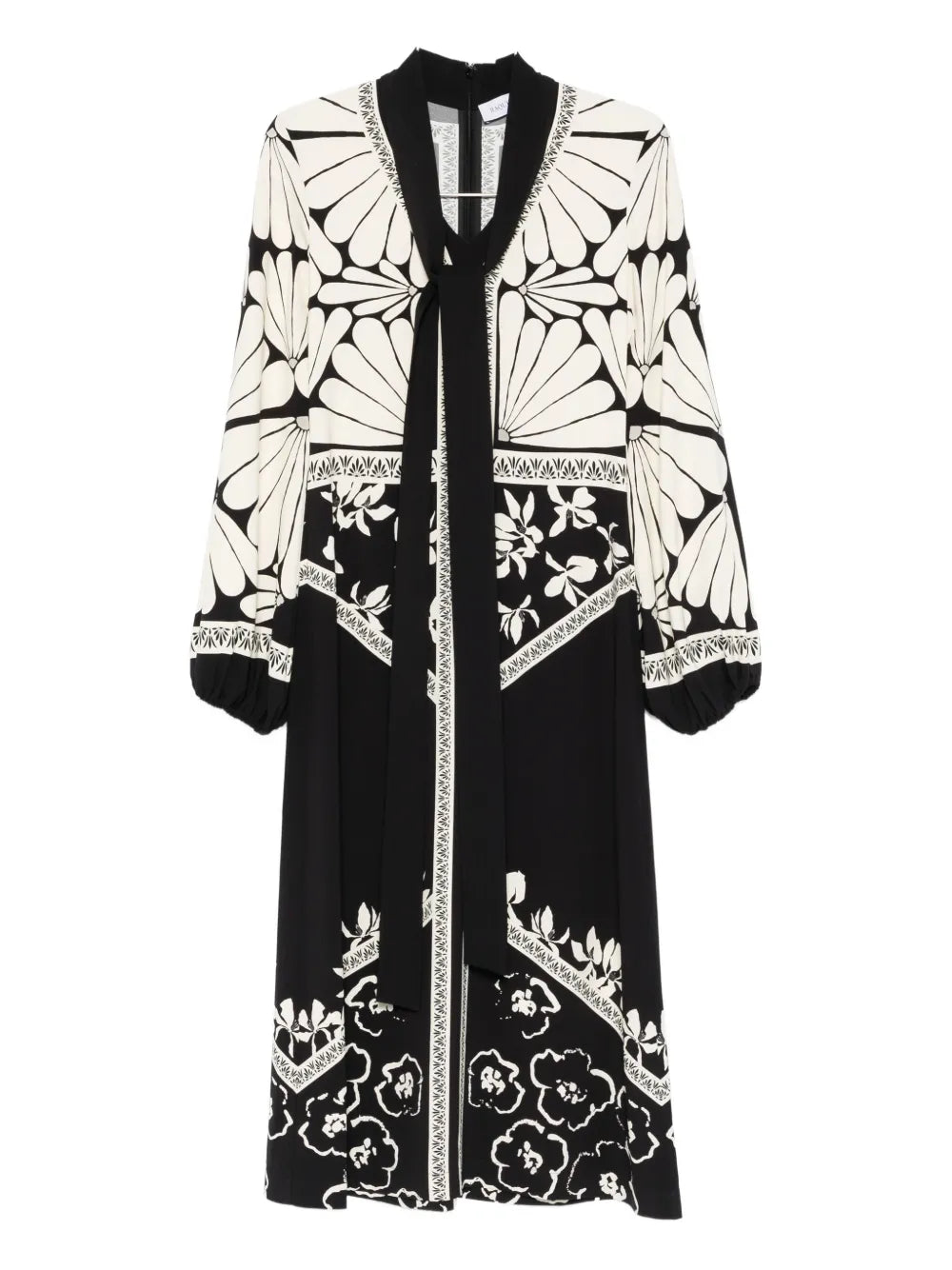 Floral print dress Black floral print, front tie detail, long sleeves, back zip closure Origin: Italy Composition 96% viscose, 4% elastane Washing instructions Read the manufacturer`s instructions ID 5M03026