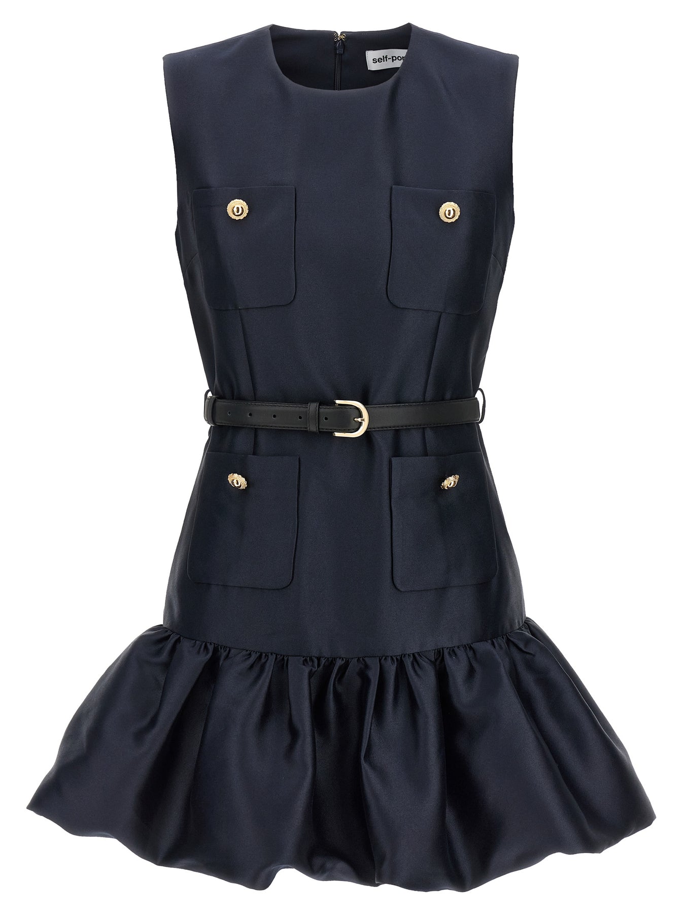 Taffeta 'Navy Taffeta Mini' sleeveless dress with crew neck, button patch pockets, balloon skirt, back zip closure, removable leather belt.