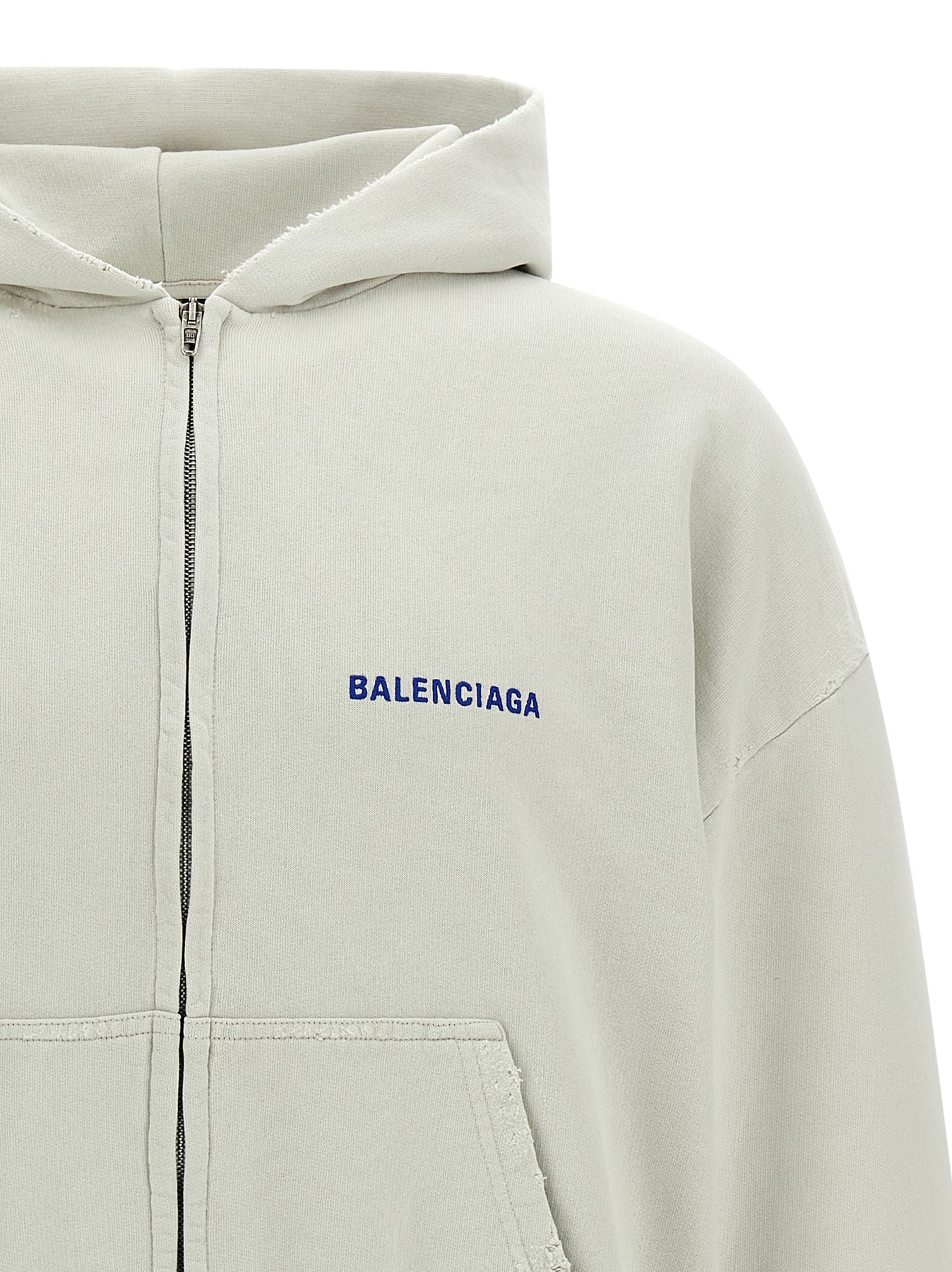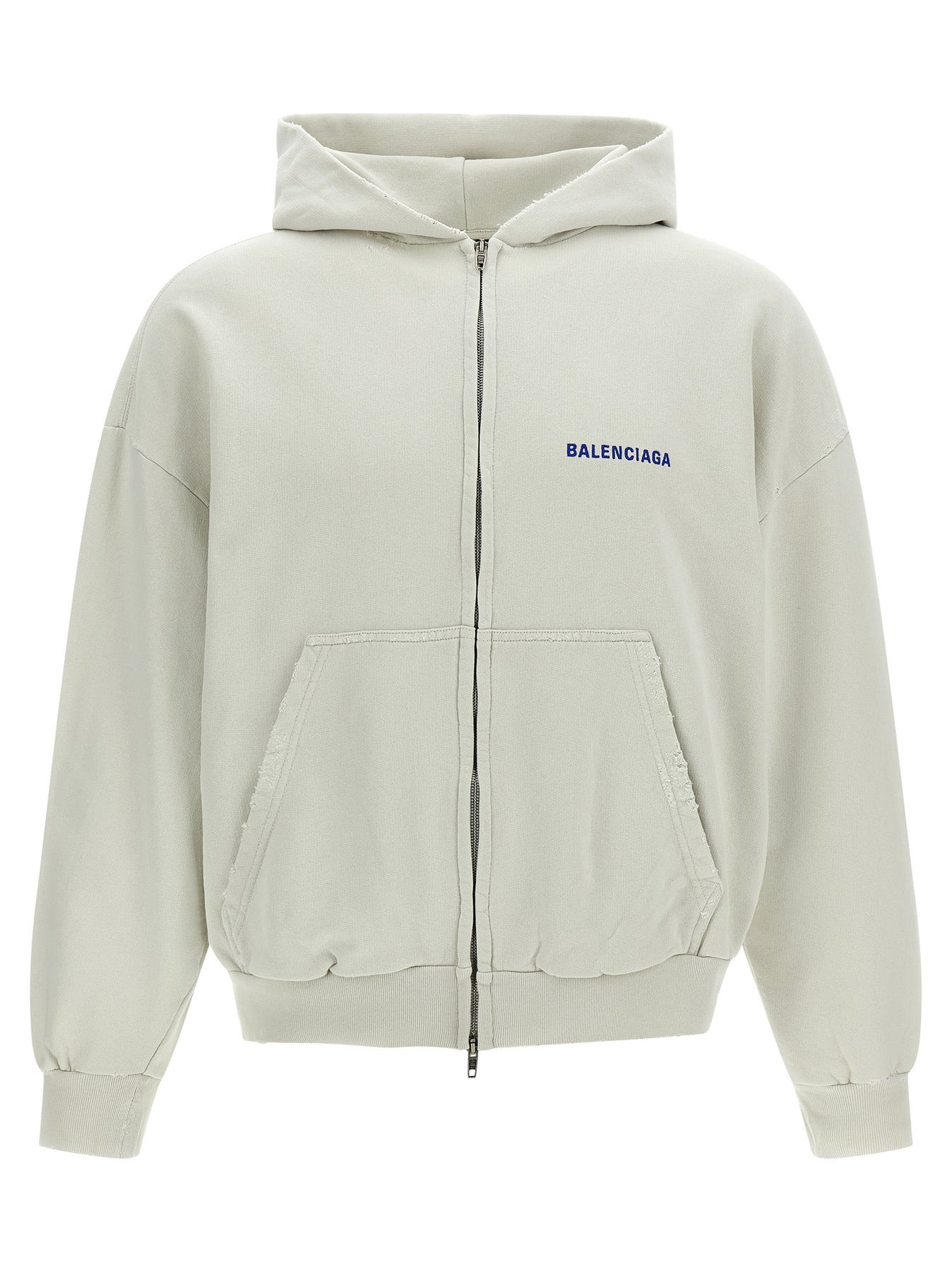 Dry used-effect fleece hoodie with 'Balenciaga Back' embroidered logo on the front and back, front zip closure, pockets, long sleeves with cuffs and dropped shoulders.
